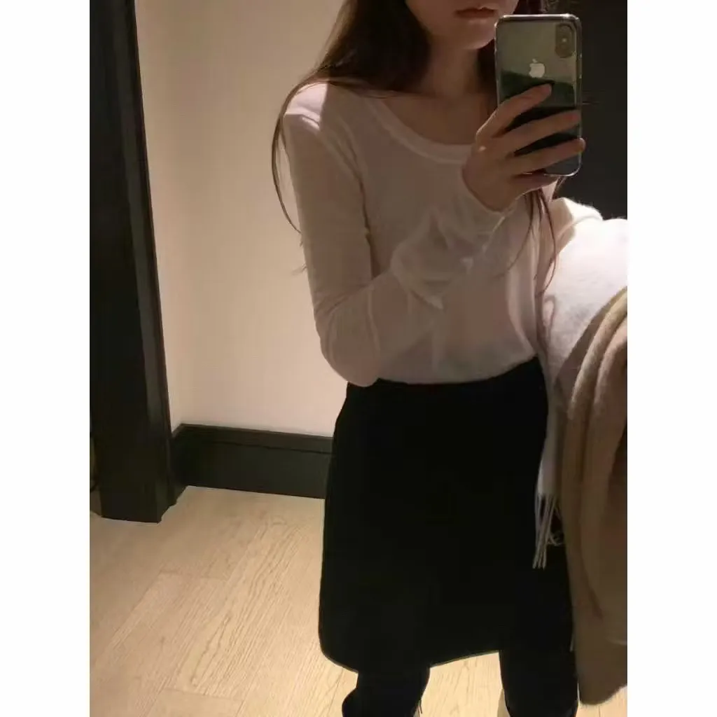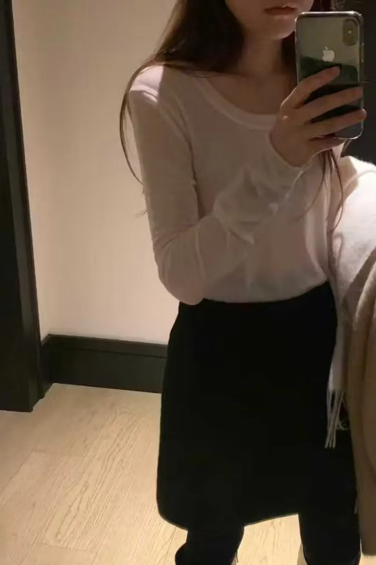 微捲邊透膚羊毛天絲上衣