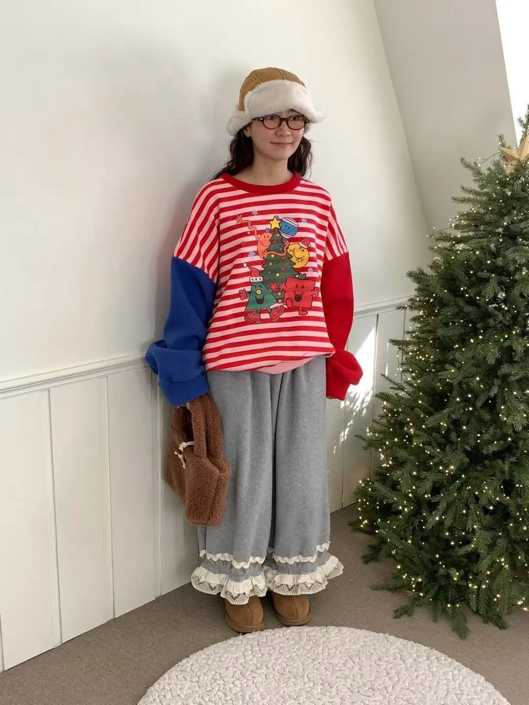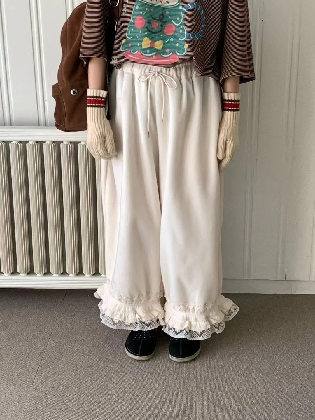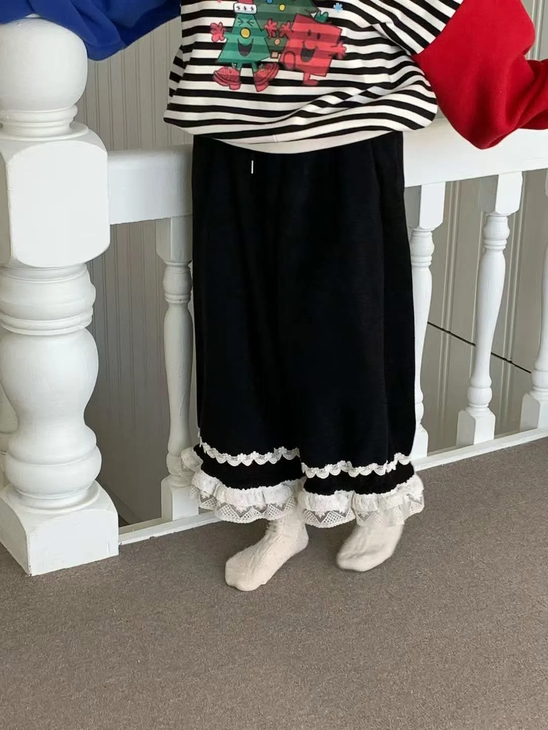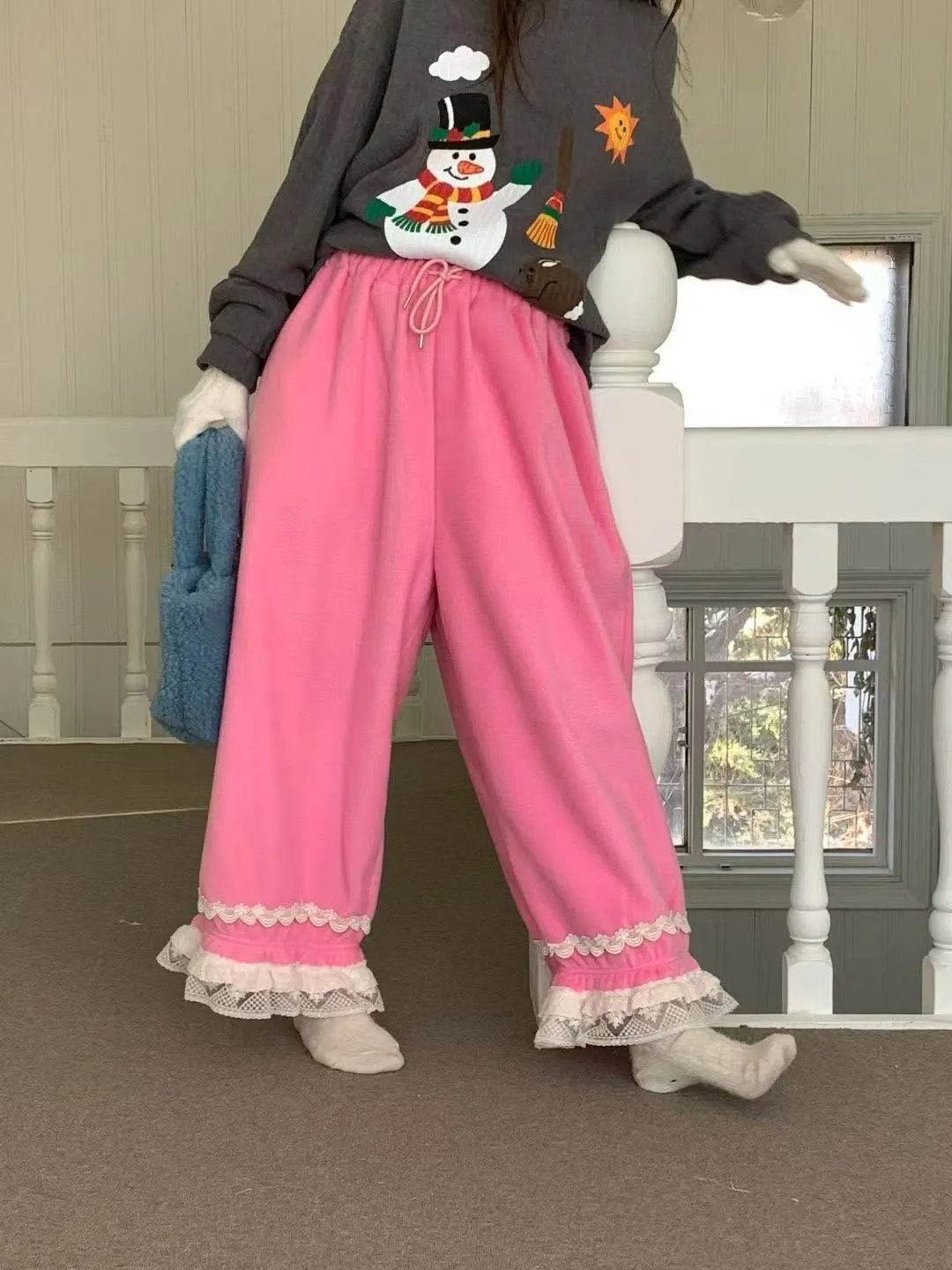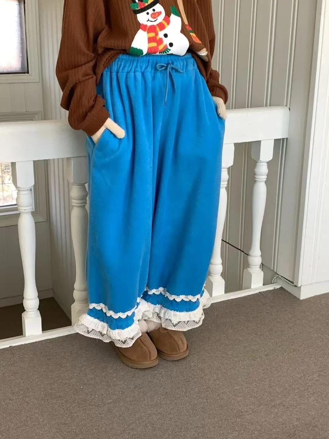 鬆緊花邊毛絨褲