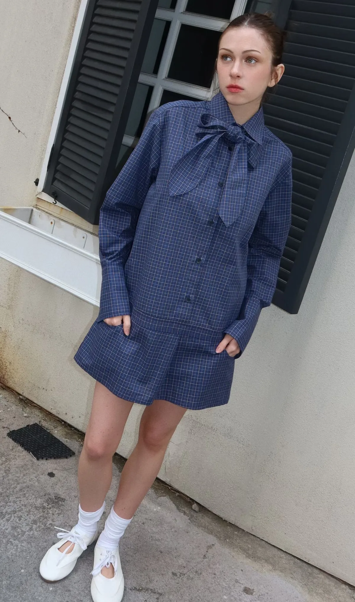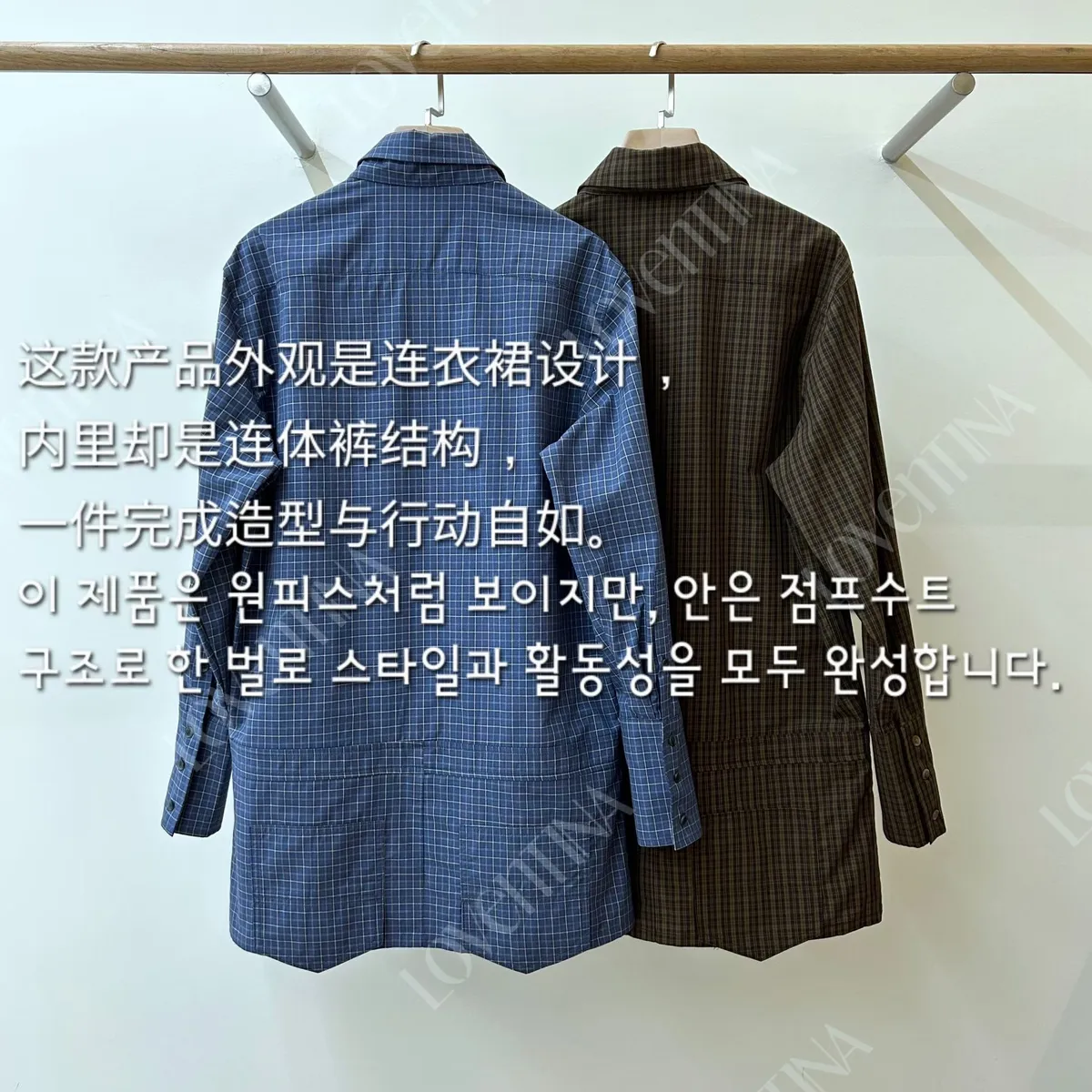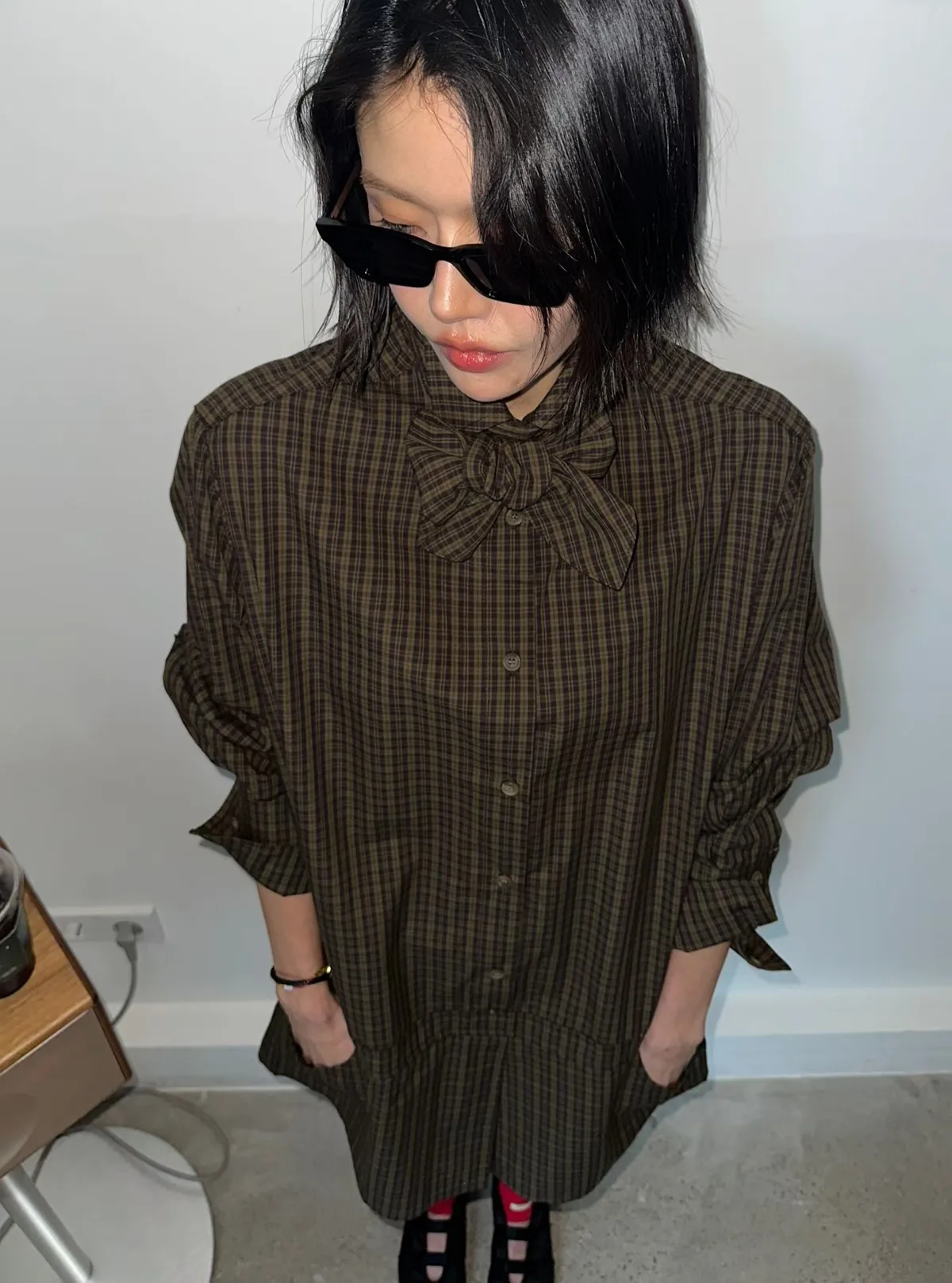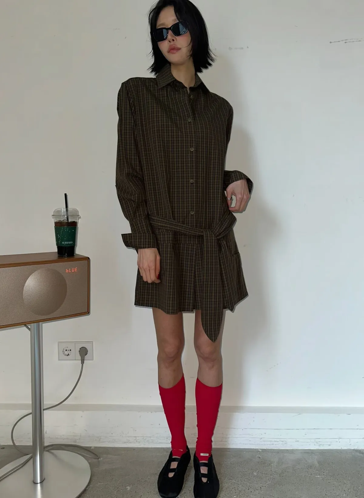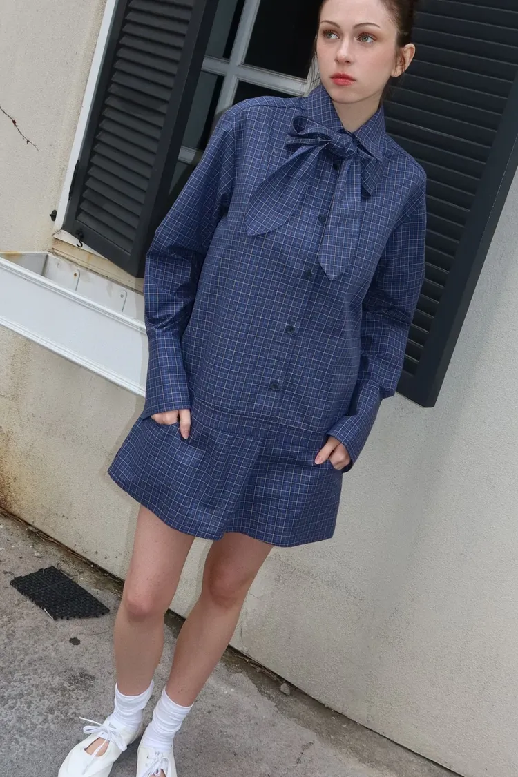 附腰帶格紋洋裝褲裙