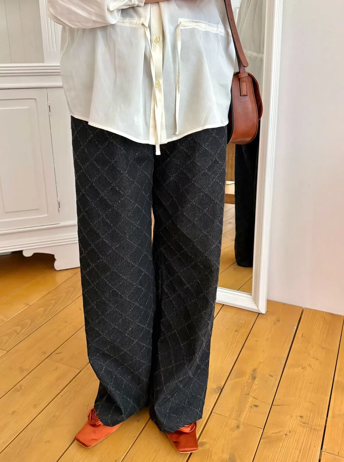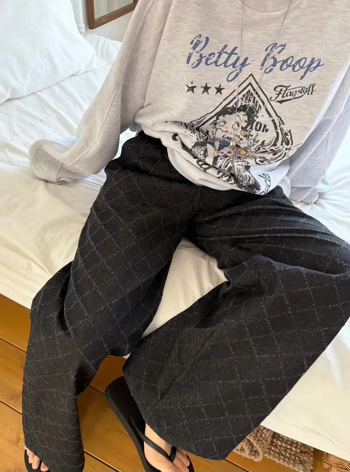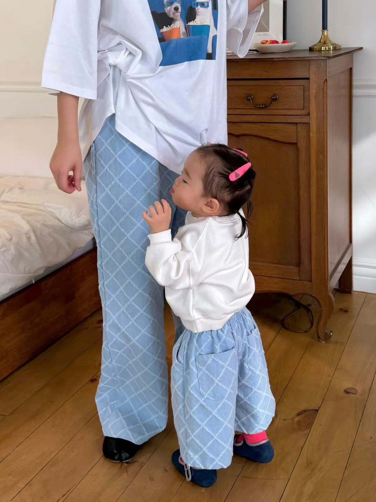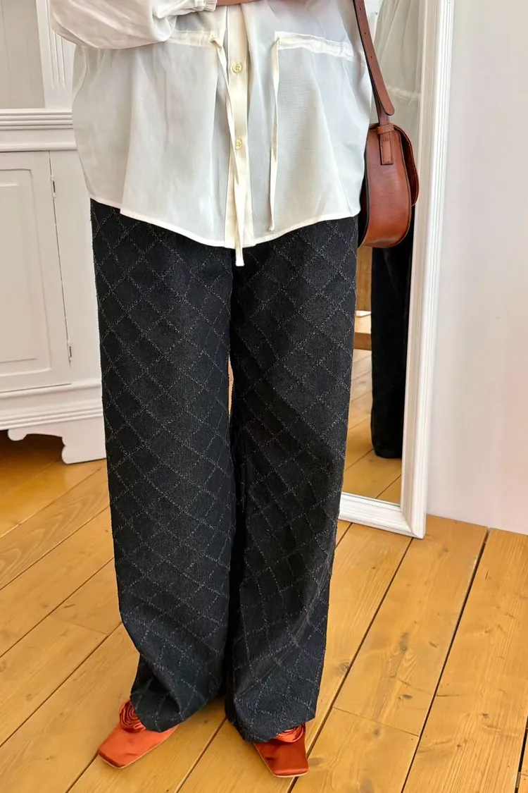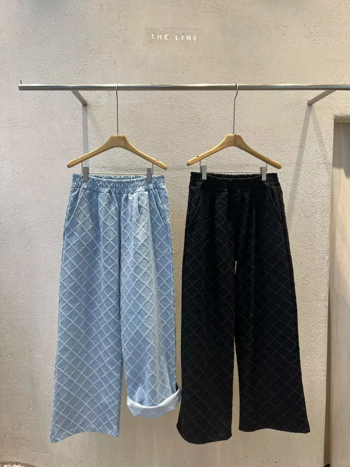鬆緊菱格紋壓線牛仔褲