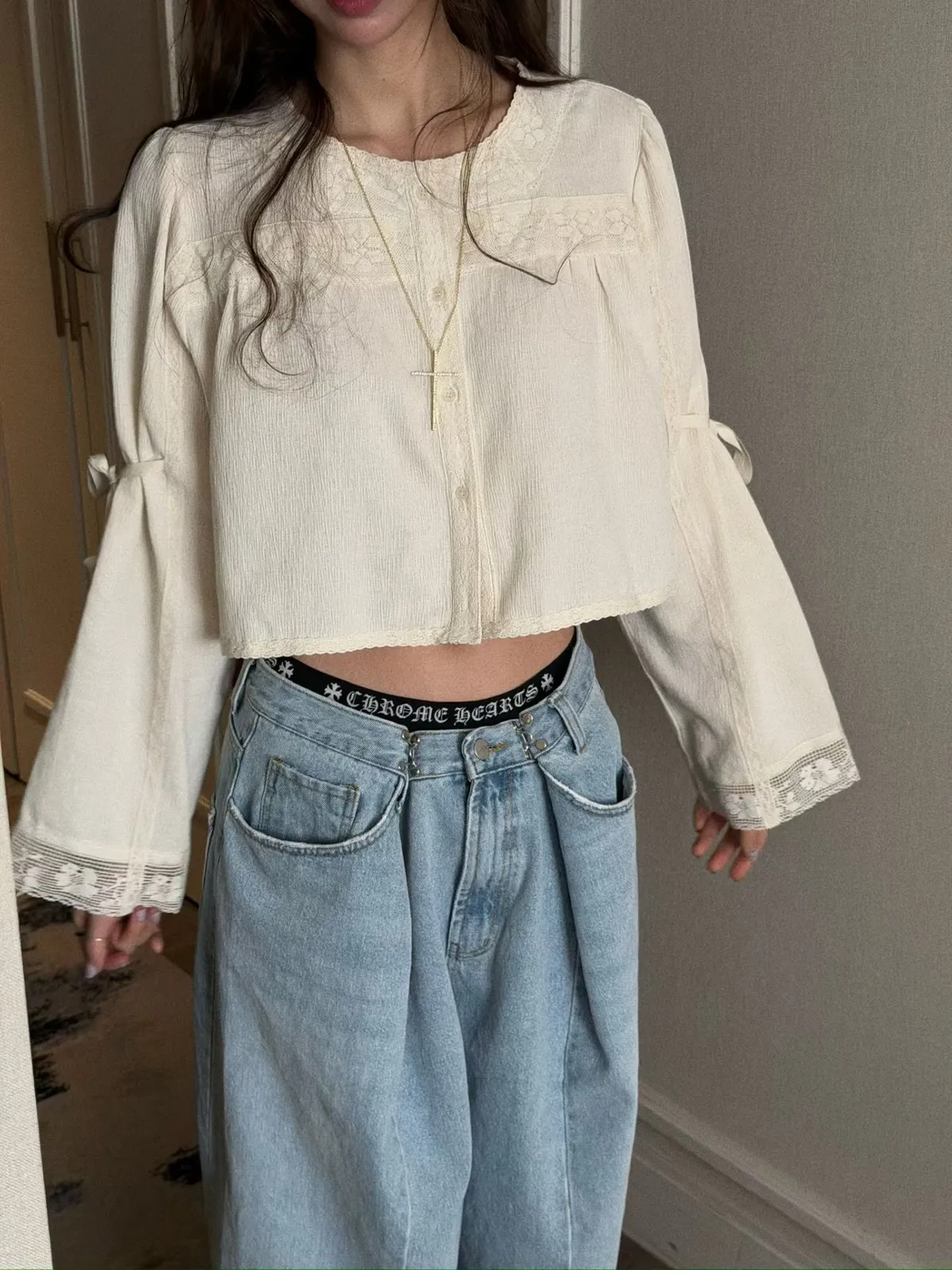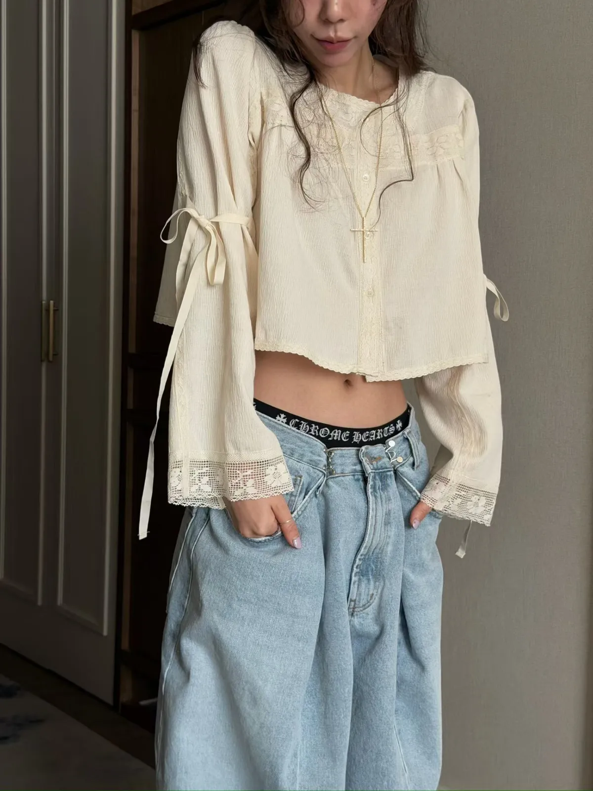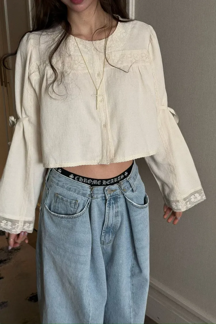 拼接蕾絲手袖綁帶上衣