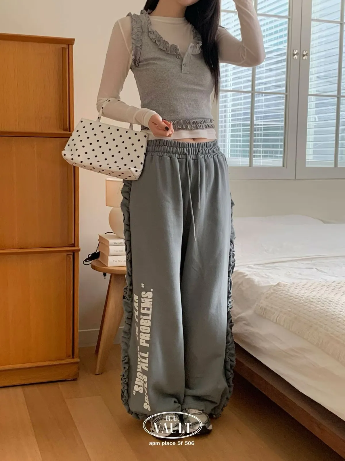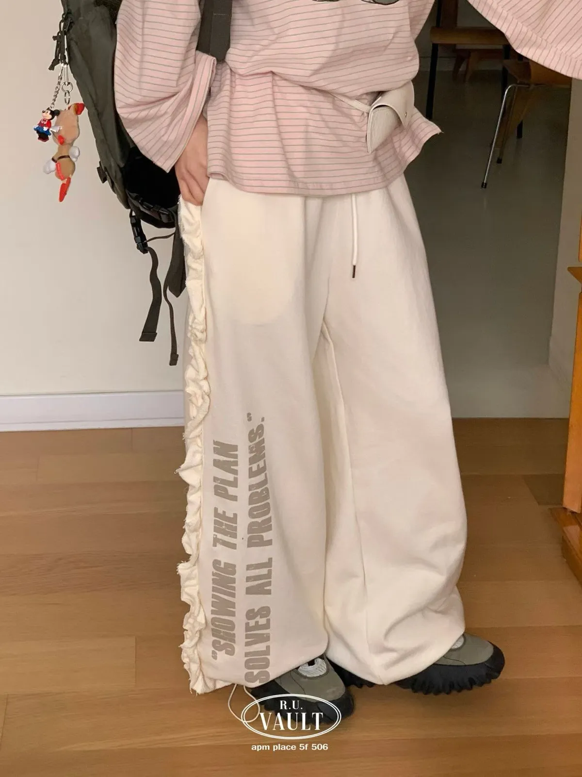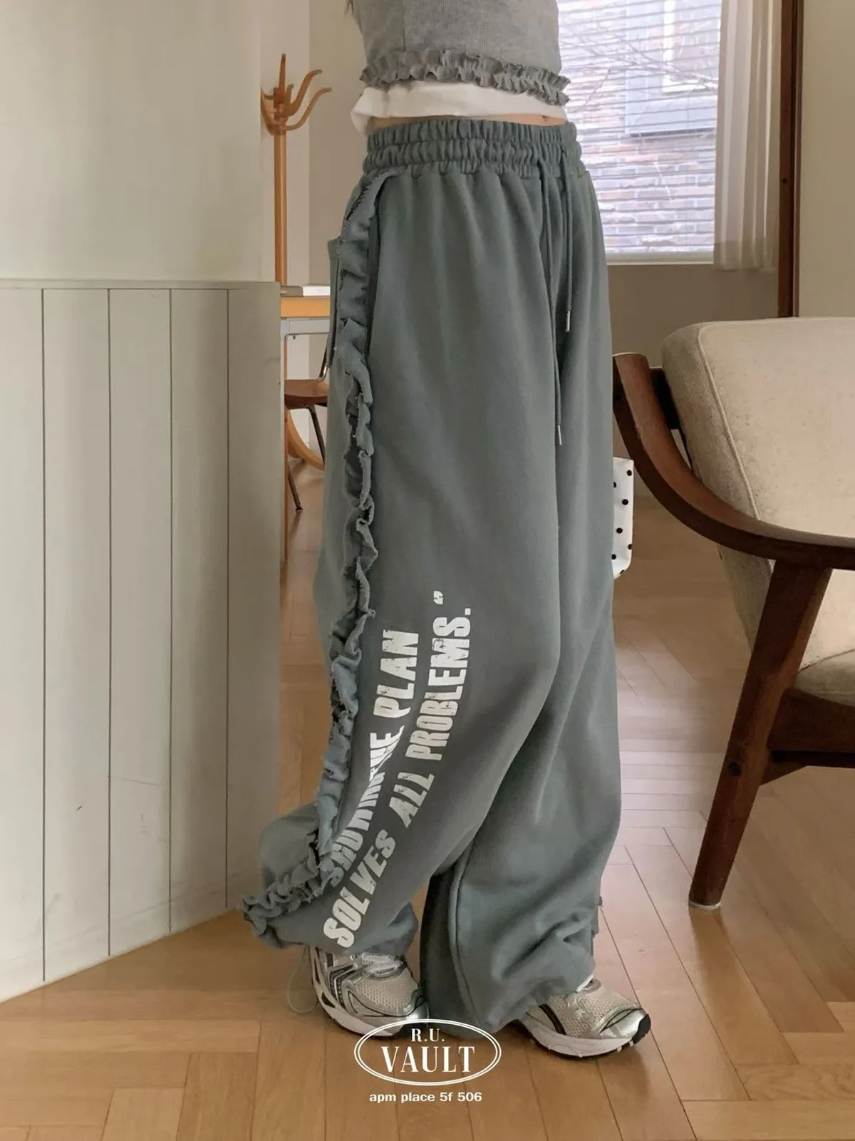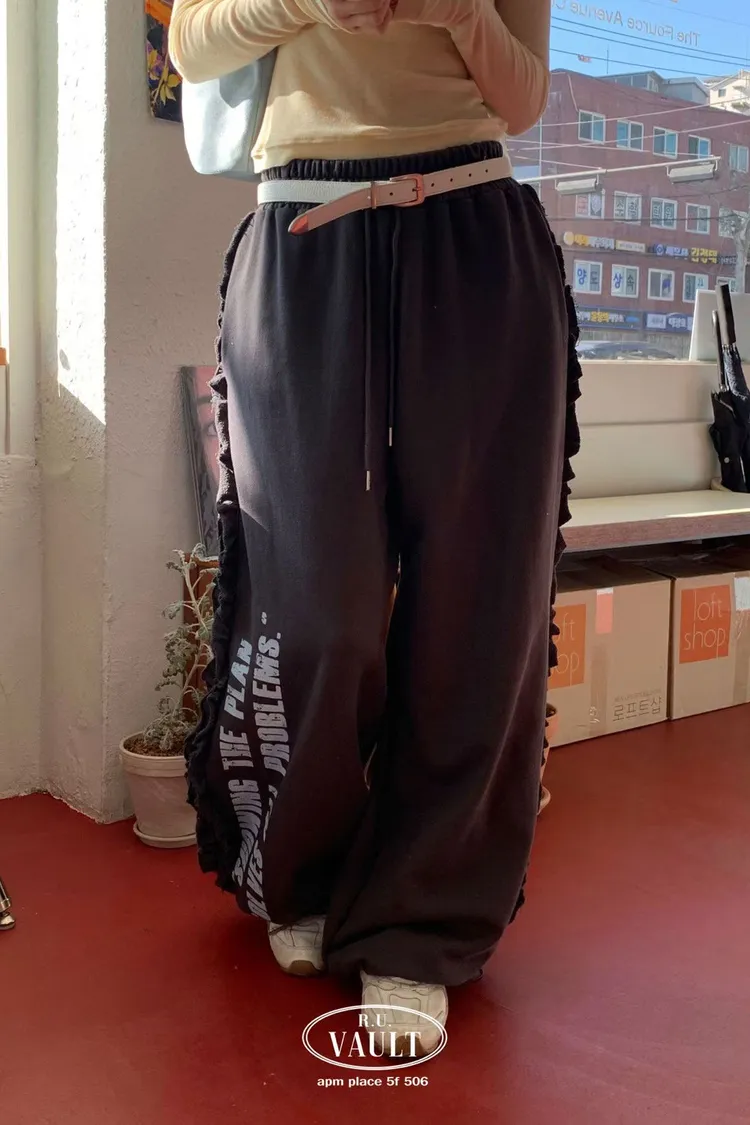 鬆緊摺邊點綴印花長褲
