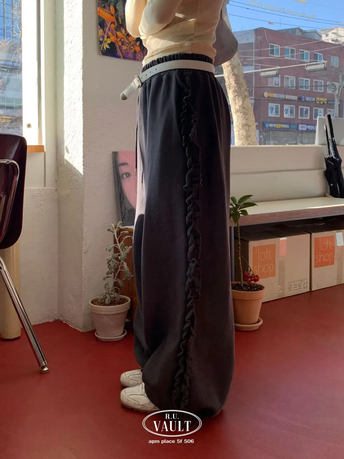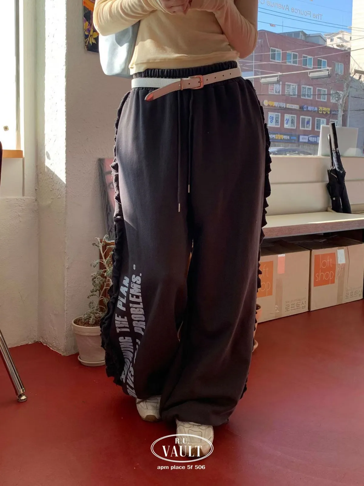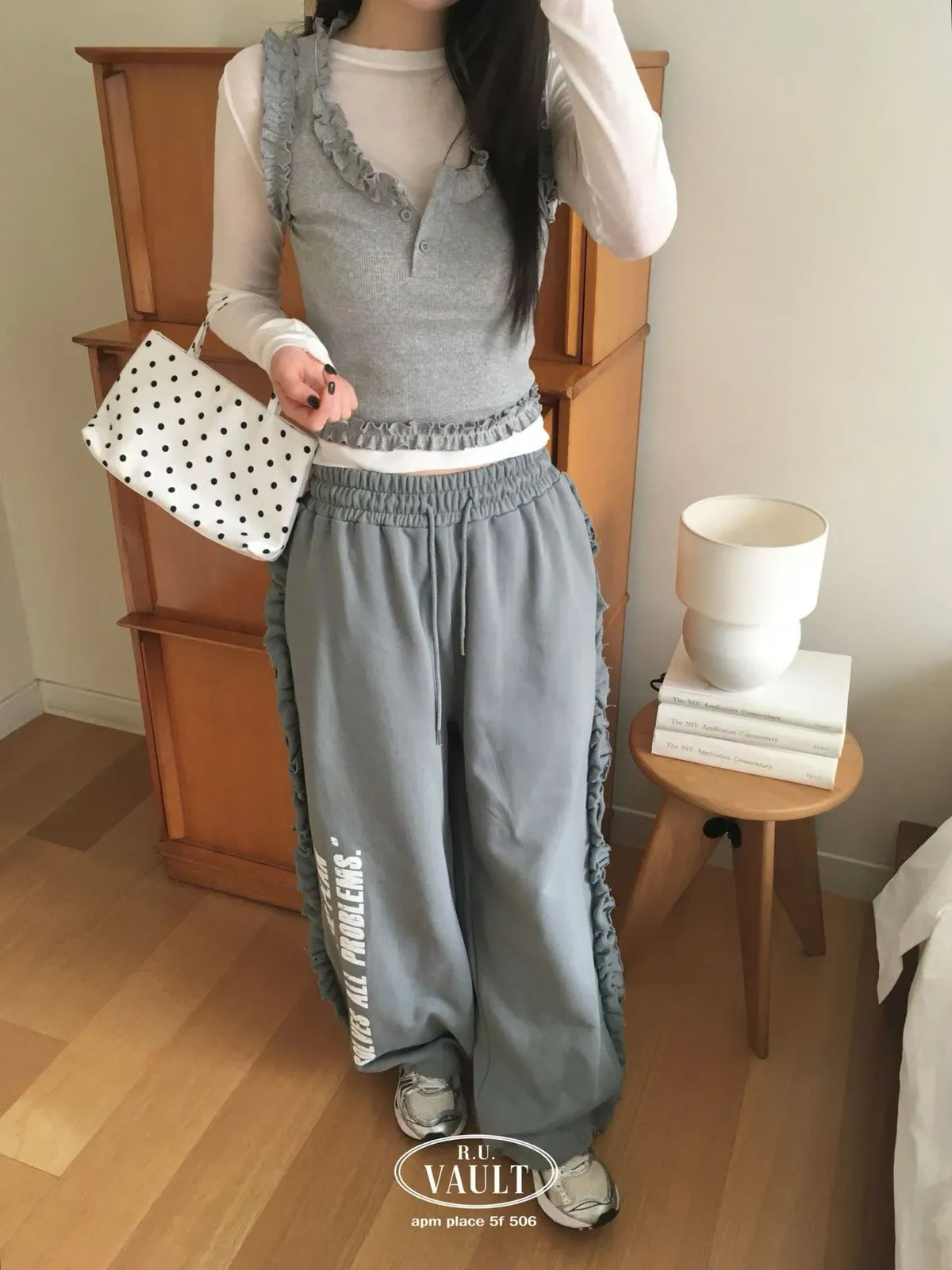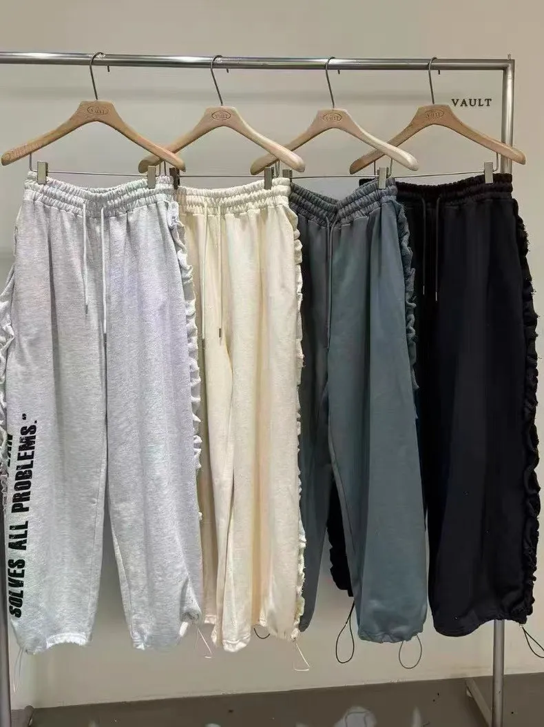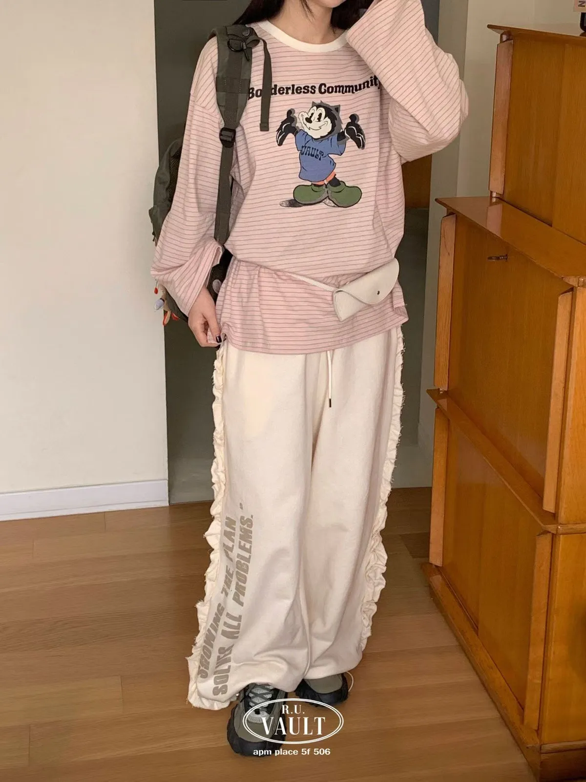 鬆緊摺邊點綴印花長褲