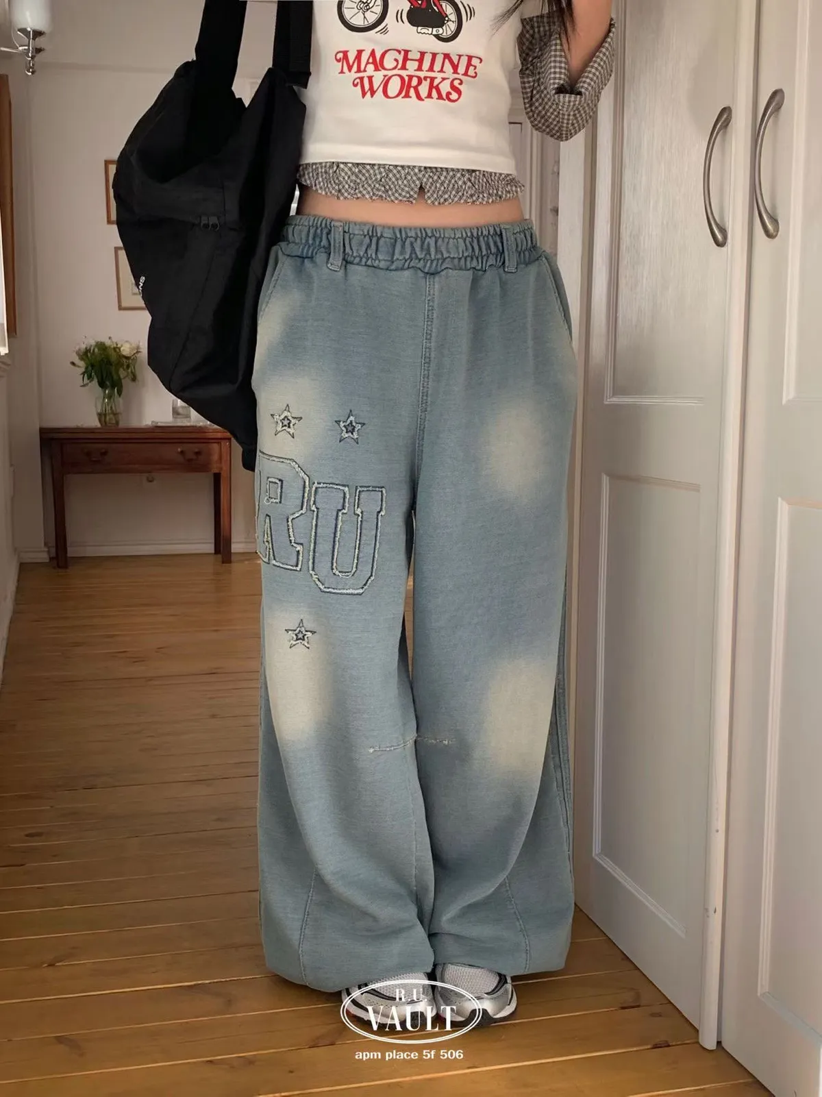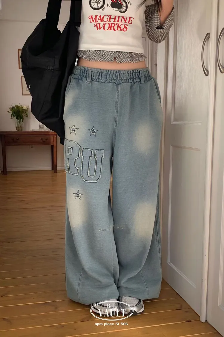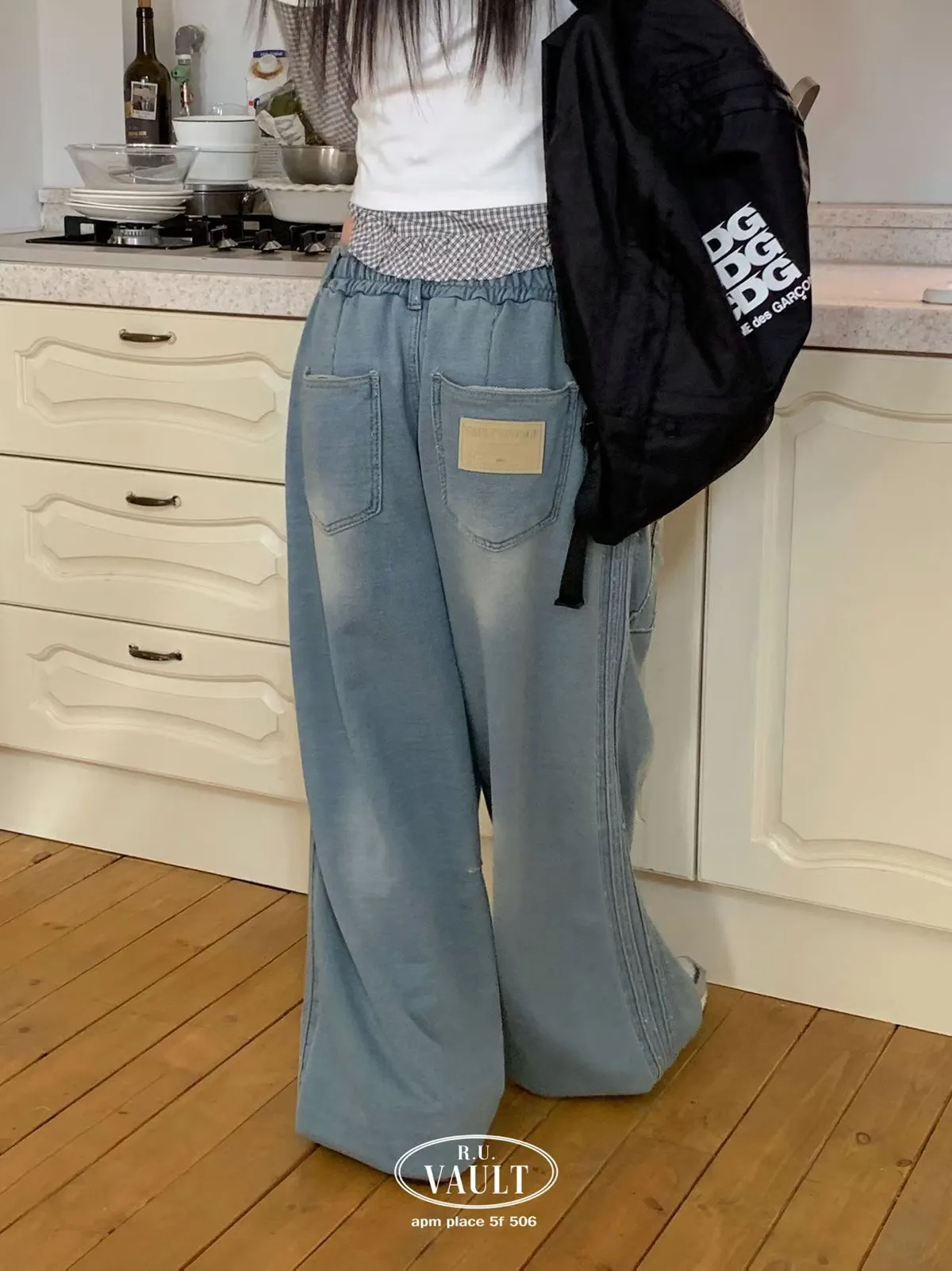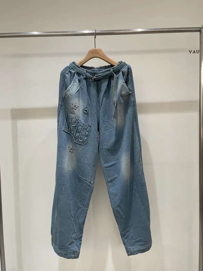 鬆緊水洗復古寬鬆直筒牛仔褲