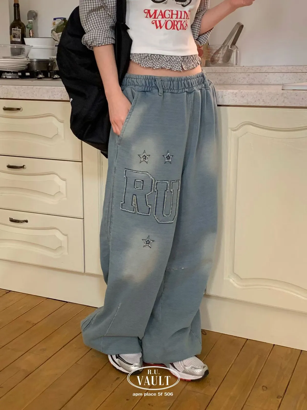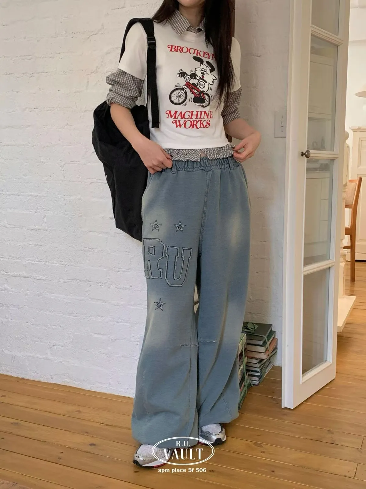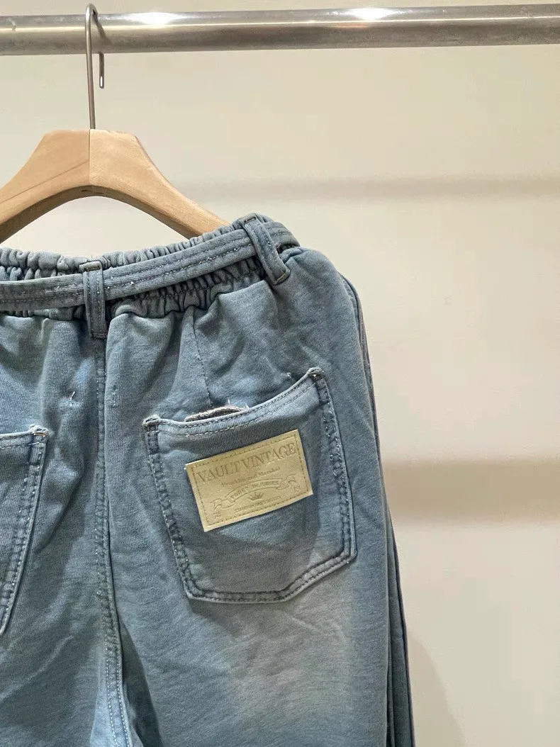 鬆緊水洗復古寬鬆直筒牛仔褲