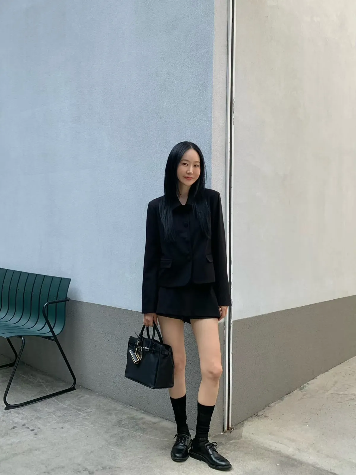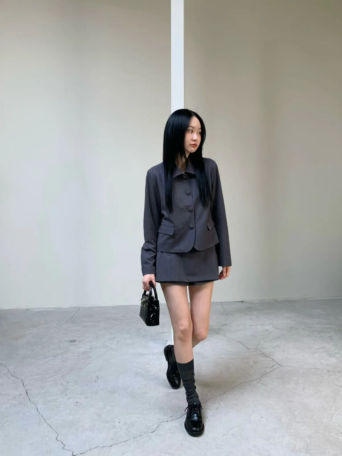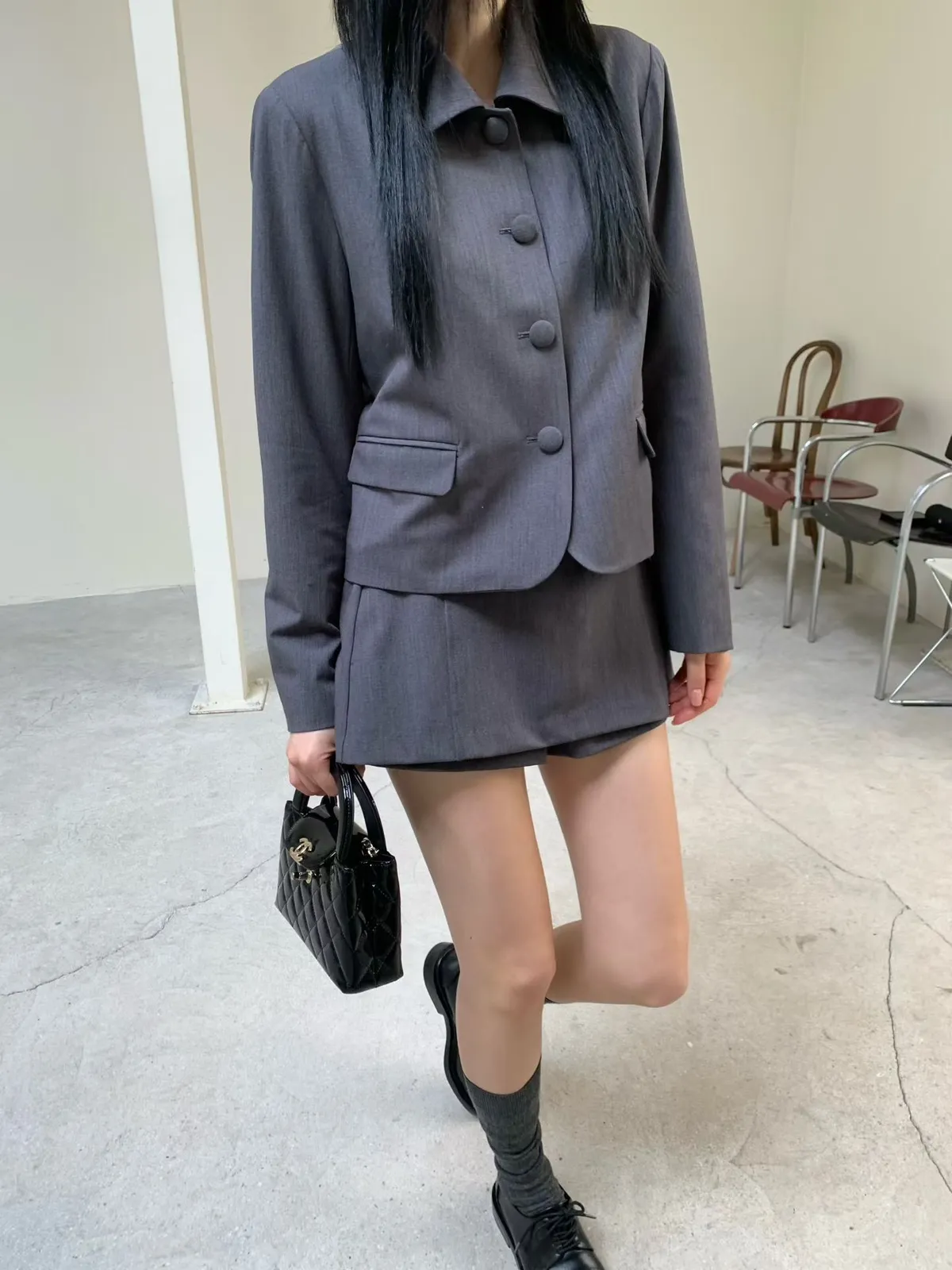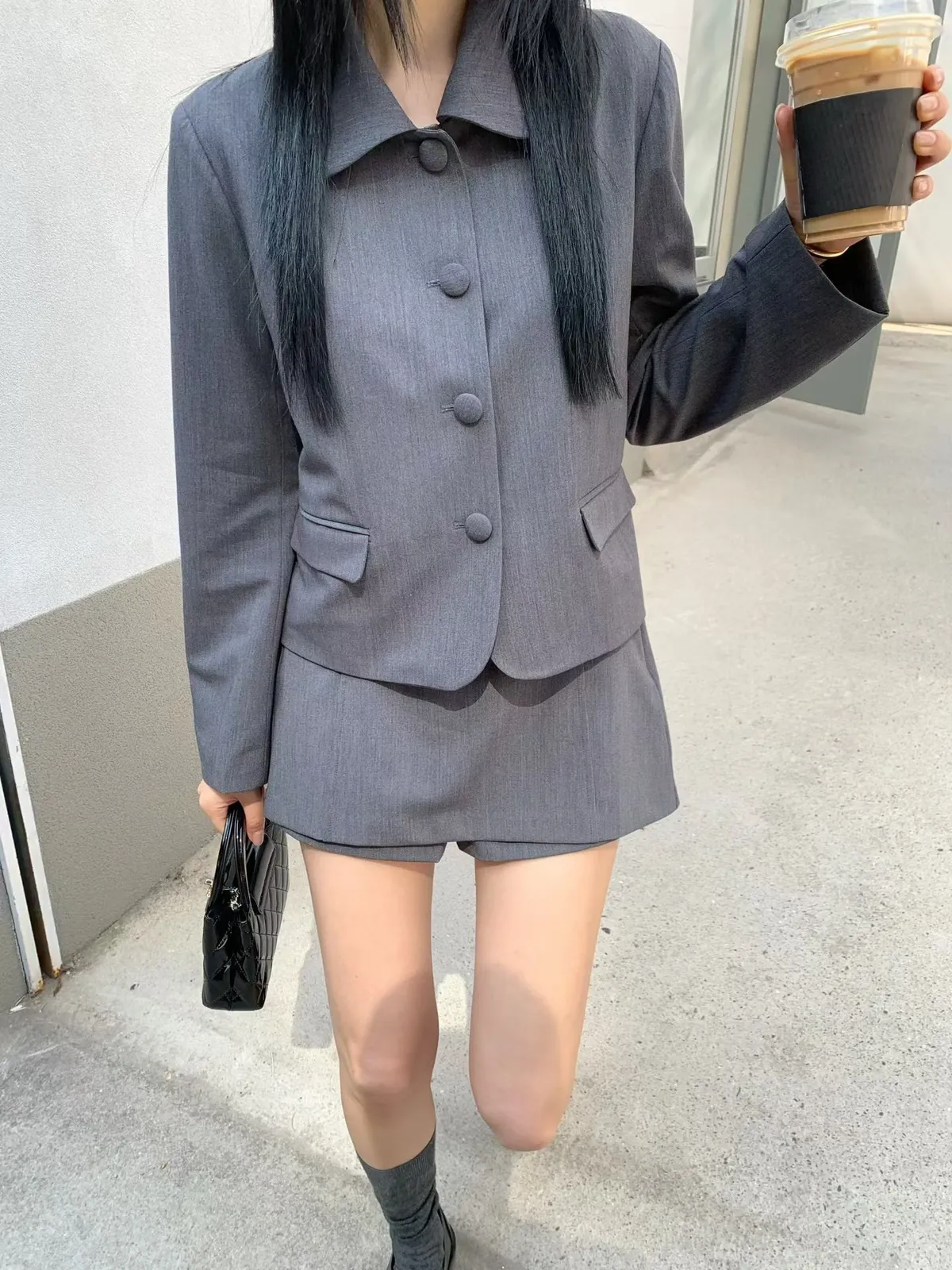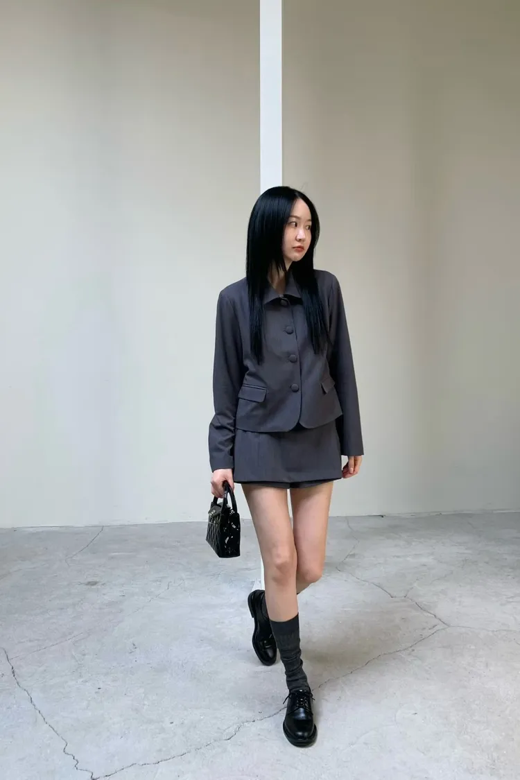 拼接圓領西裝外套短褲裙套裝