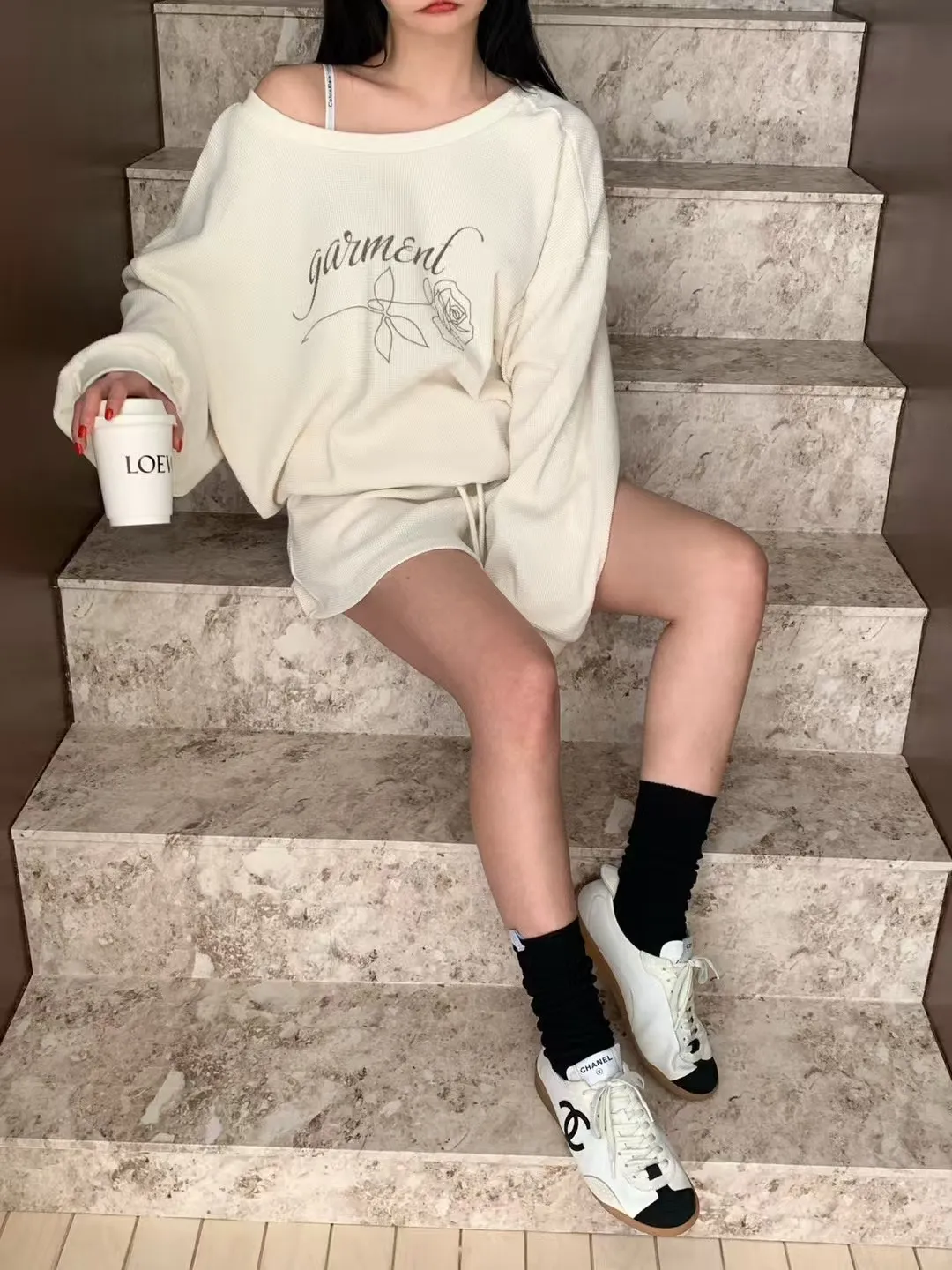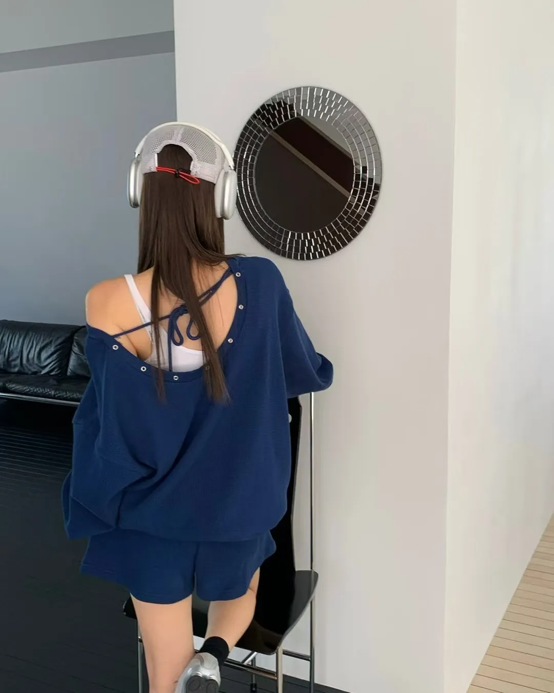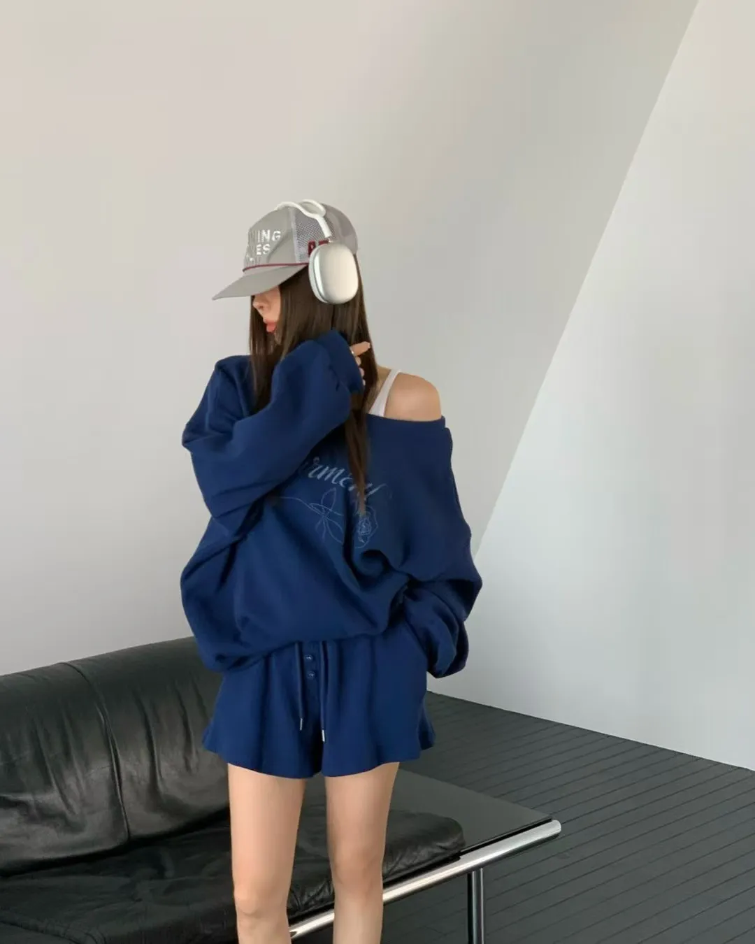 後綁繩鬆餅格紋衛衣套裝