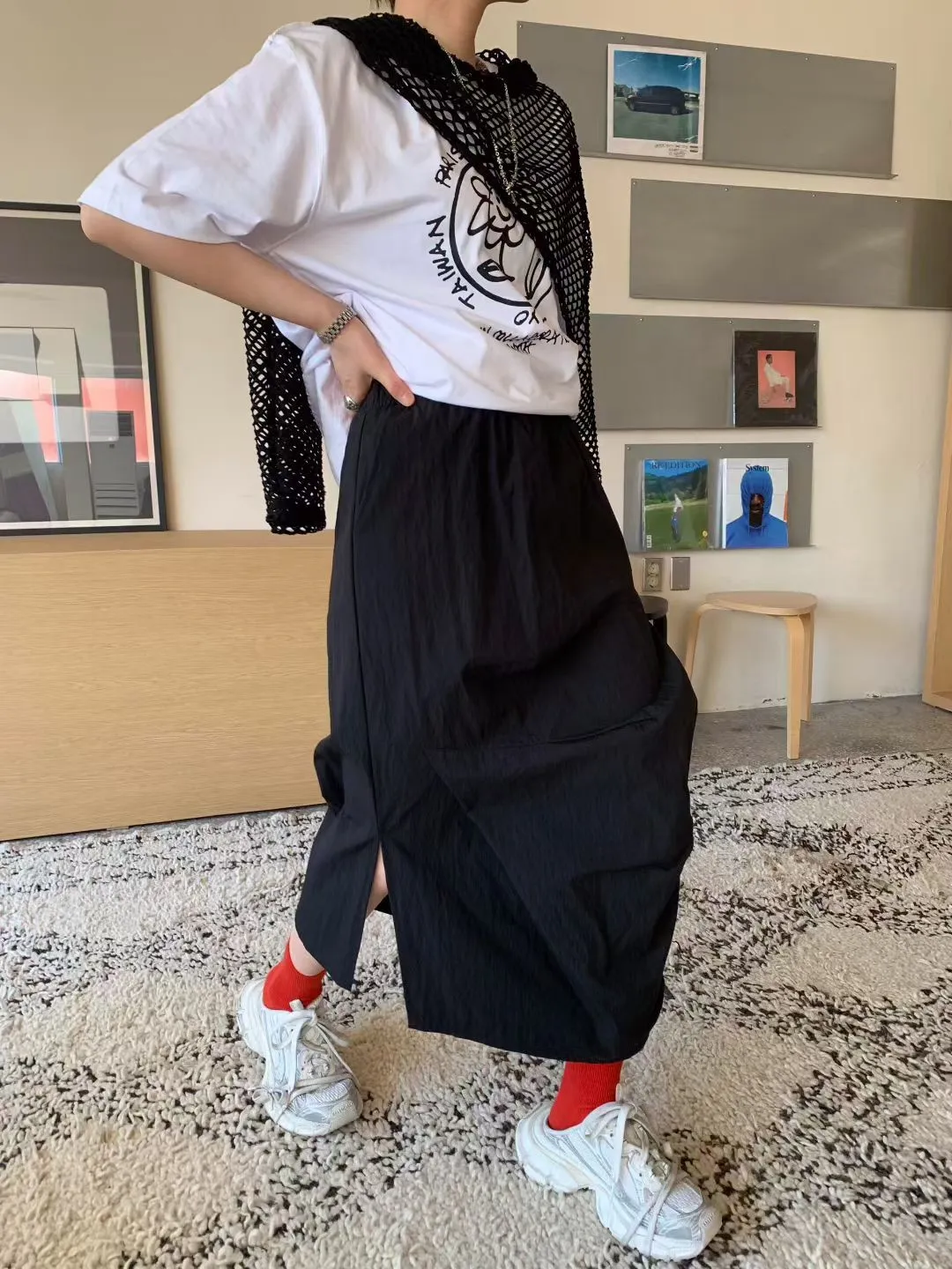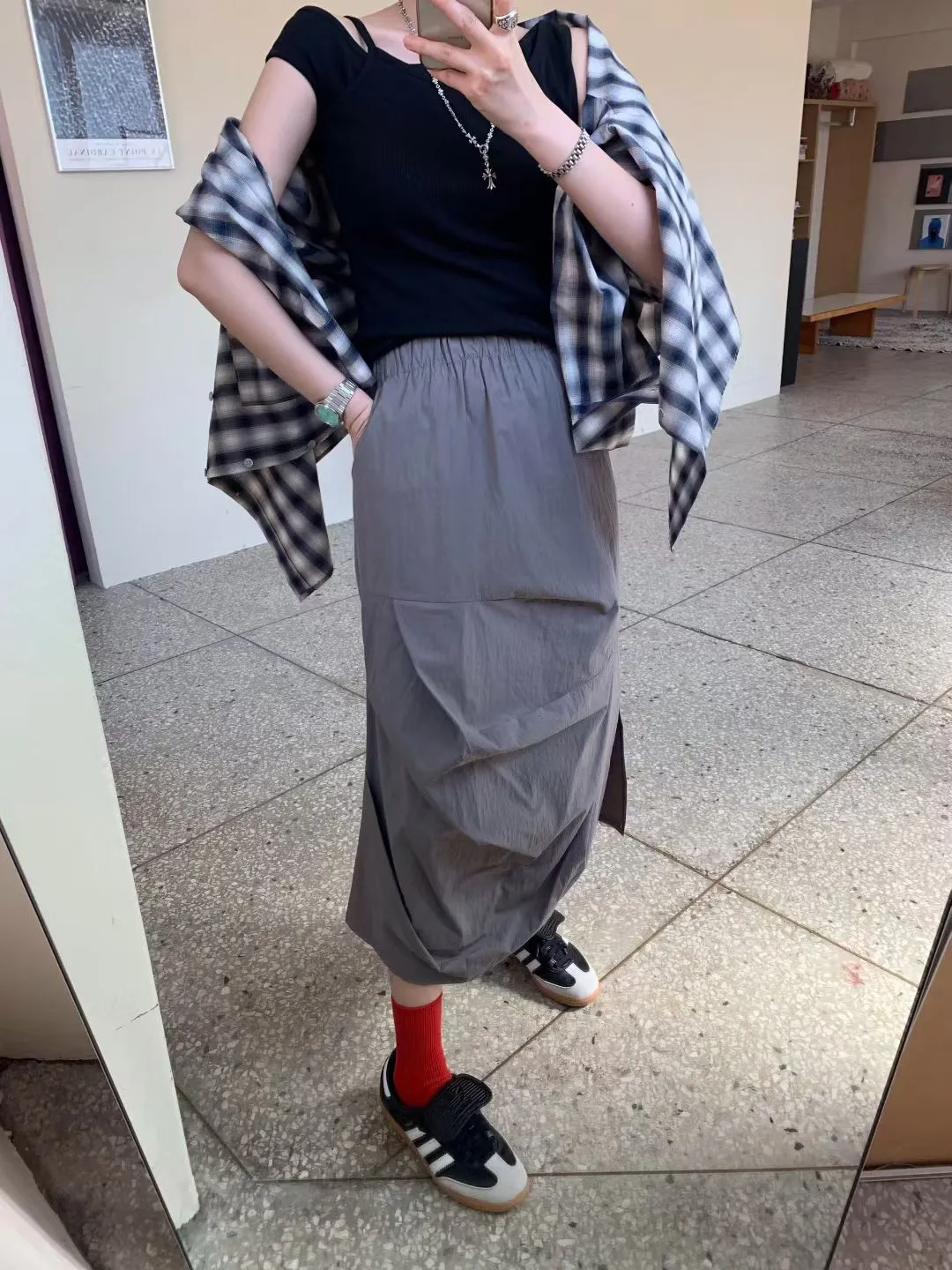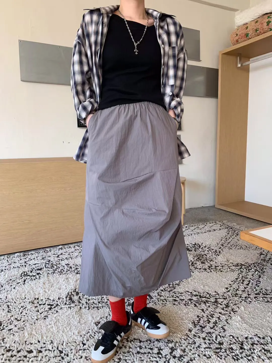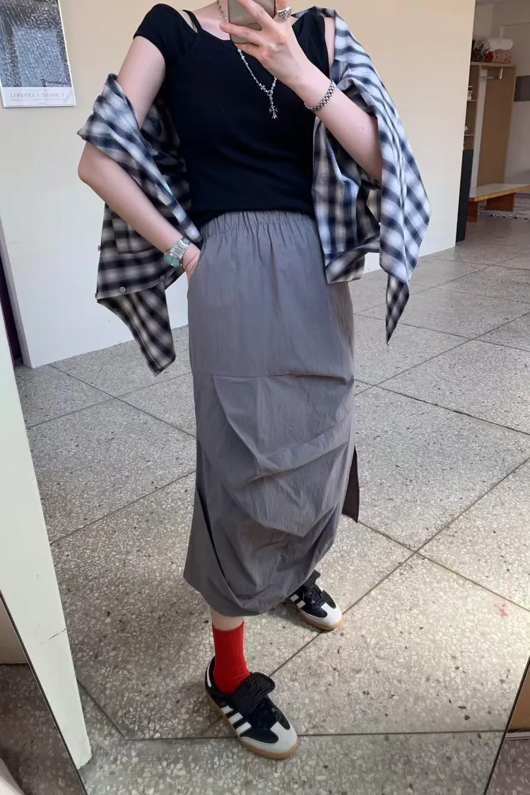鬆緊抓褶水洗側開叉長裙