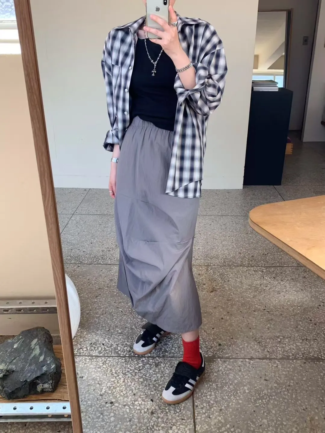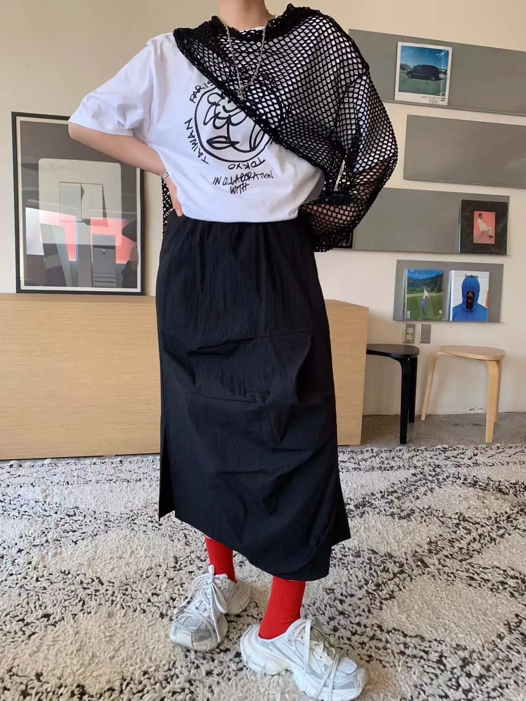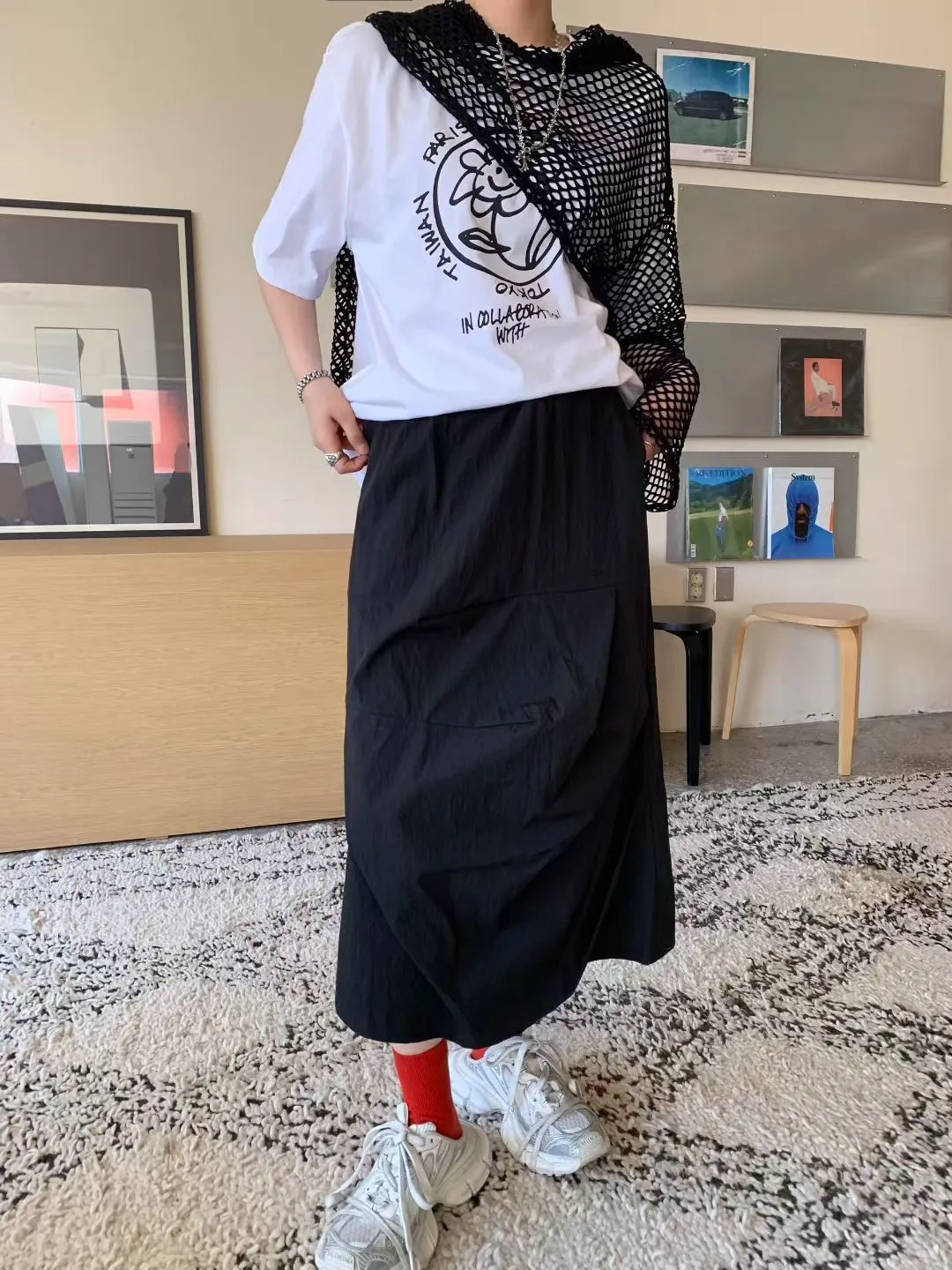 鬆緊抓褶水洗側開叉長裙