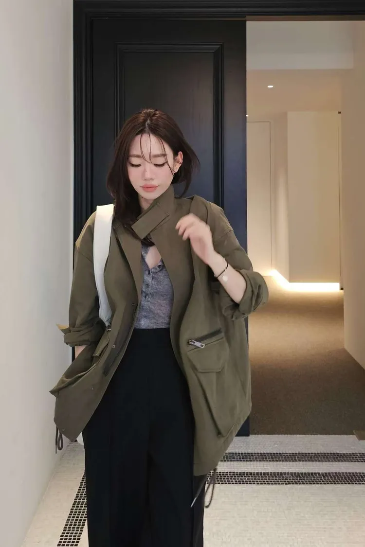 下擺有抽繩,小立領,蓋袋口袋+拉鍊口袋,中等衣長不吃身高~!