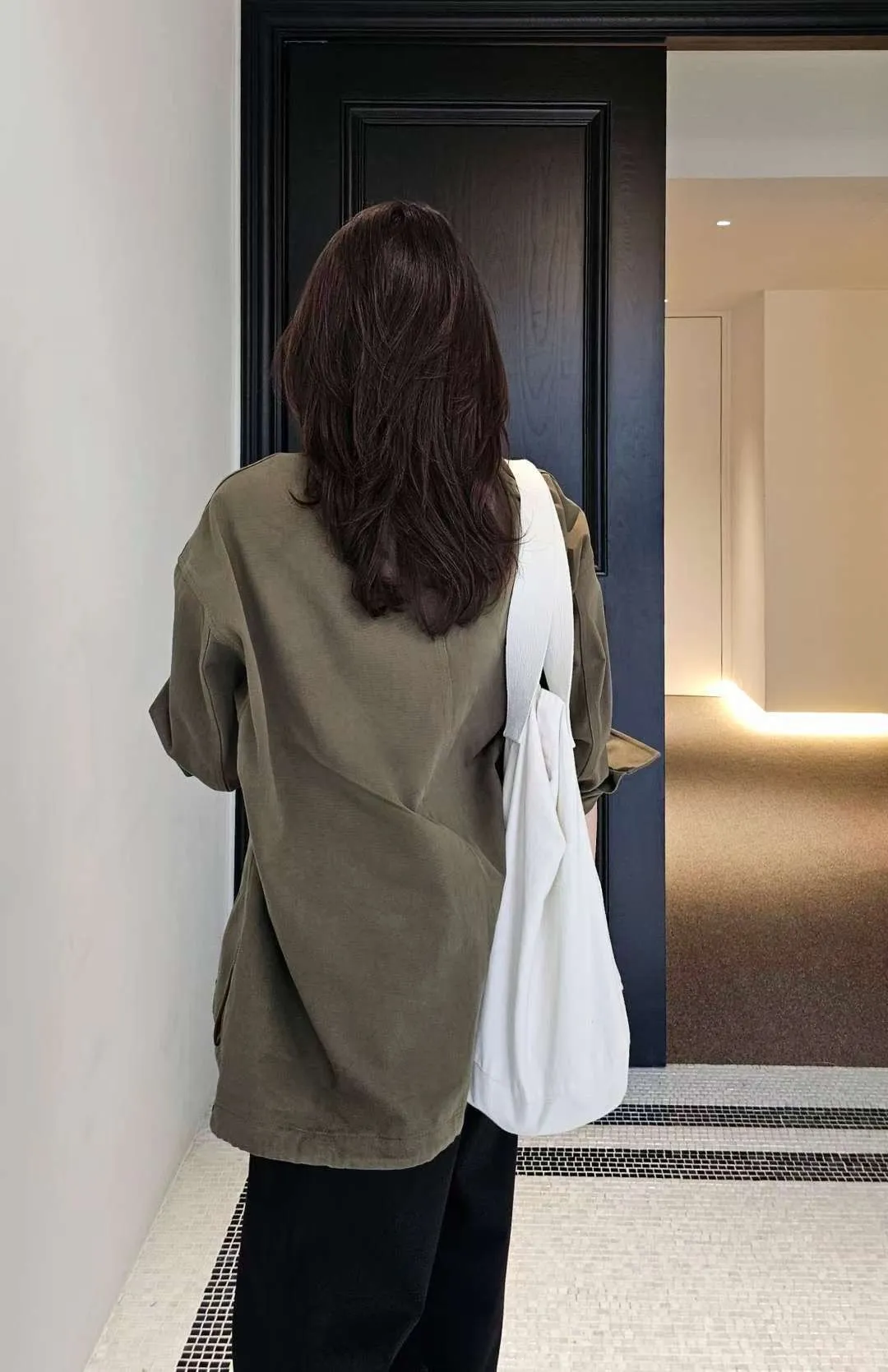 中等厚度夾克面料,布料挺而不硬,內層是漂亮的內包邊,沒有內裡,整體不會厚重👌😎