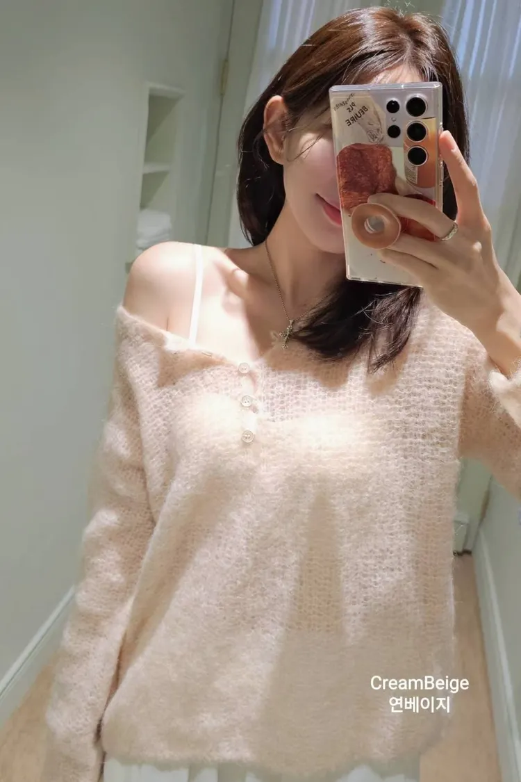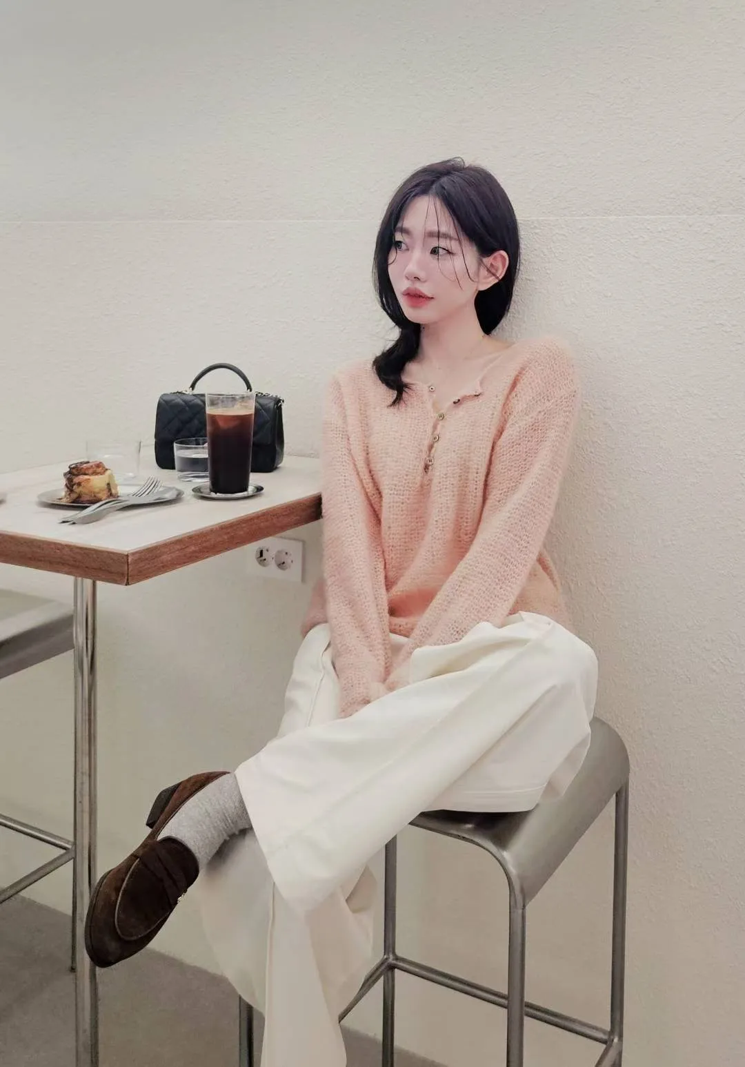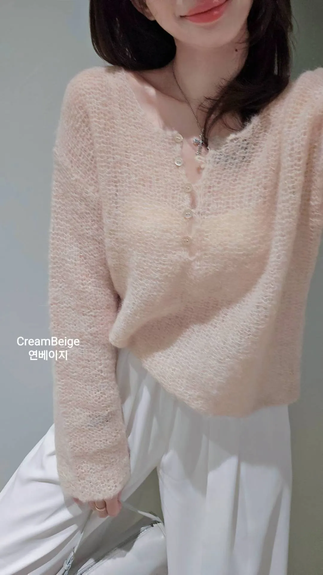 溫柔小姐姐的空氣感毛衣~ 半開襟亨利領設計,單穿或是疊搭都很適合的一款毛衣,透肌的空氣感好美。也可以把釦子穿在背後,稍微開釦露出後頸線條也很美🥰