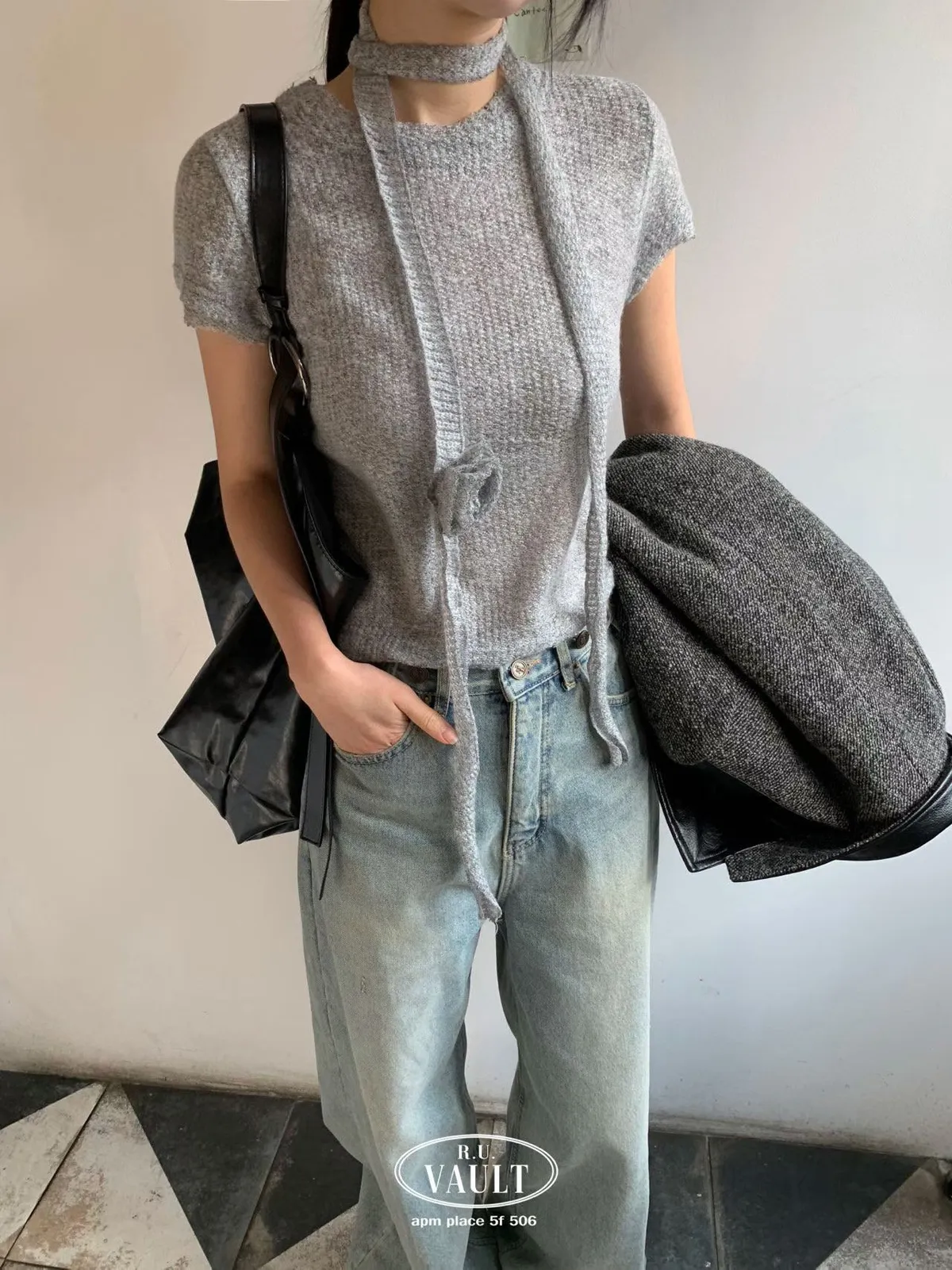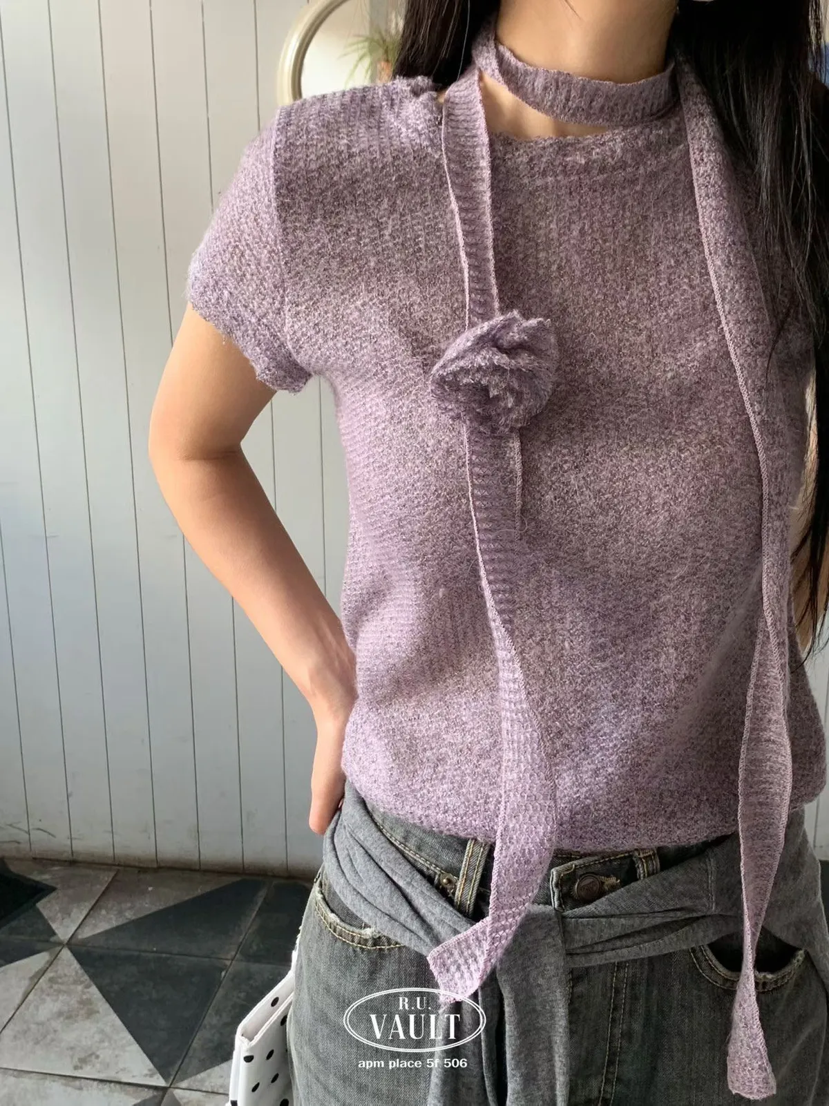 附圍巾短袖針織毛衣