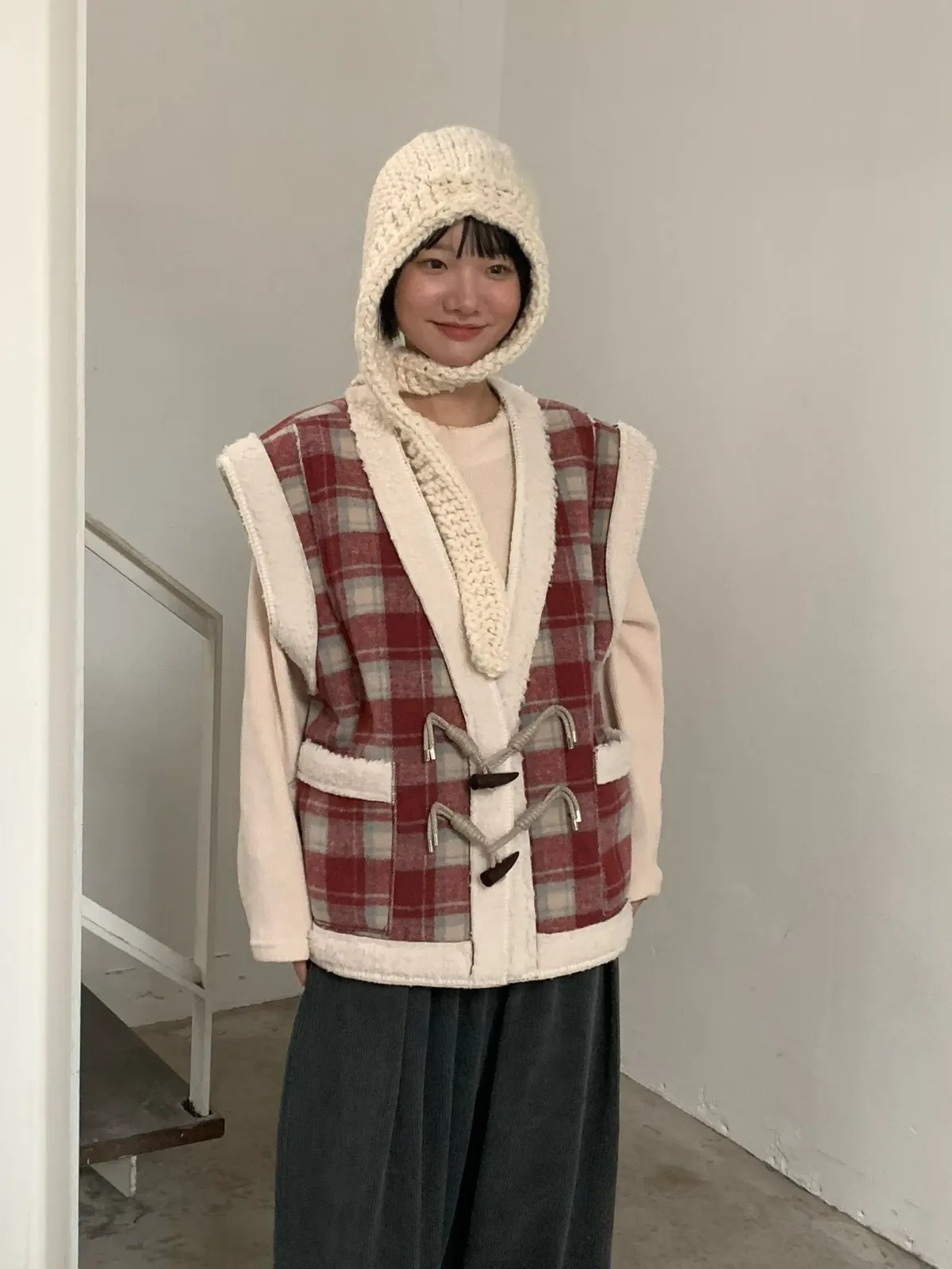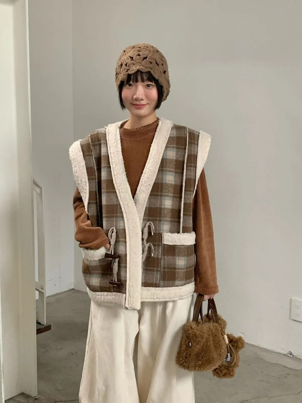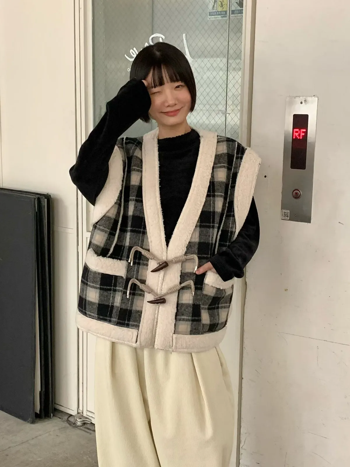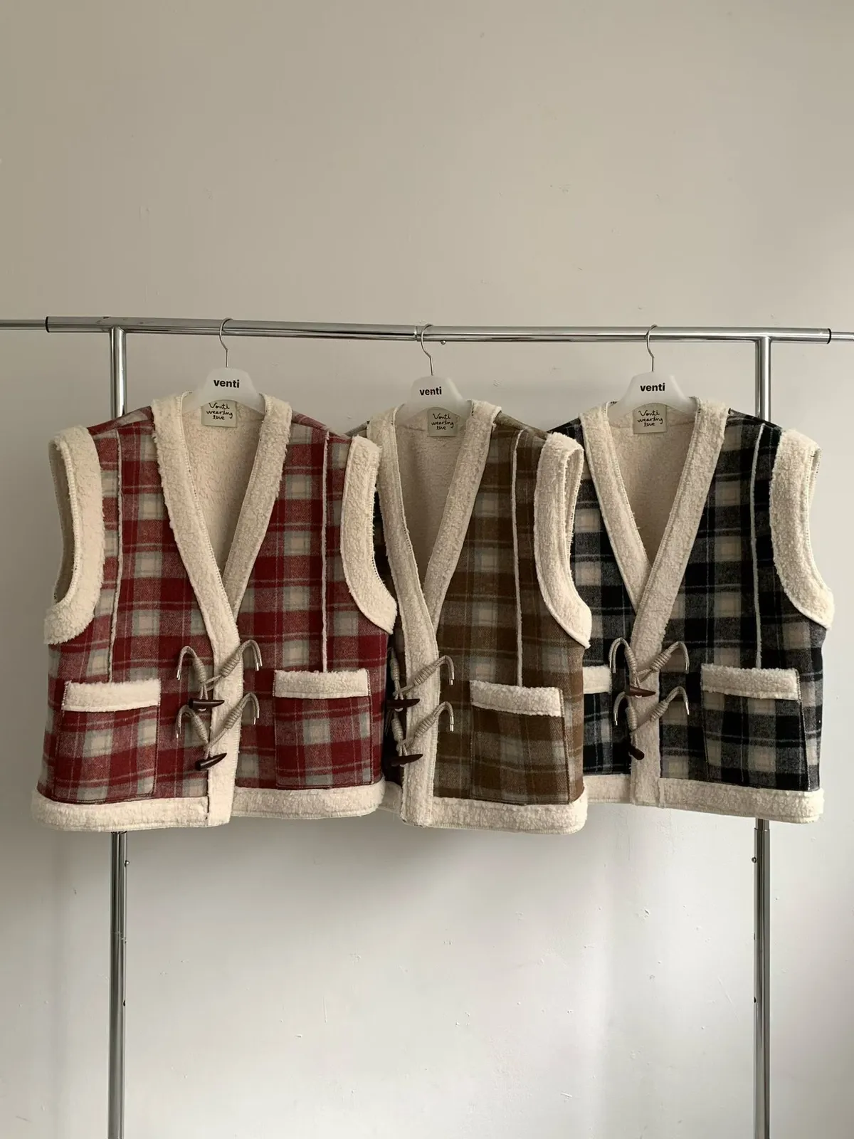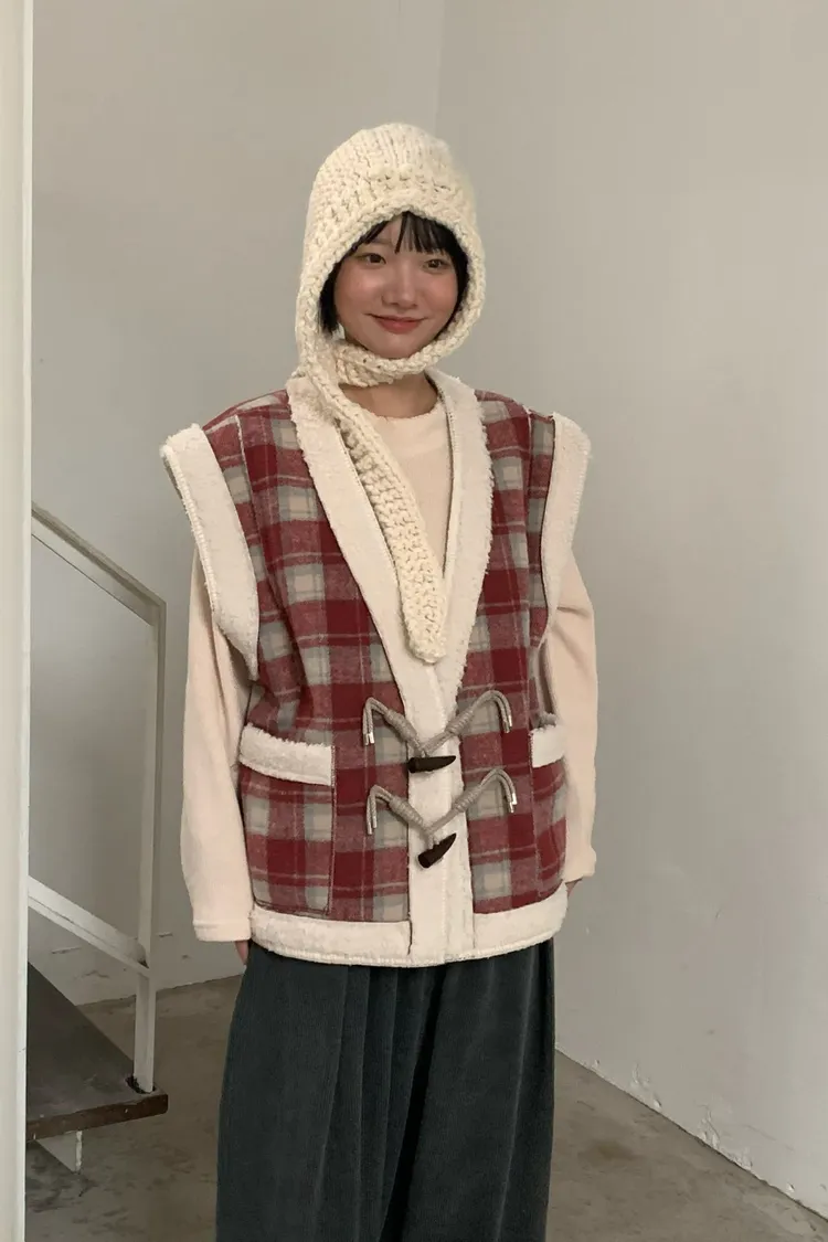 格紋牛角釦羊羔毛背心外套