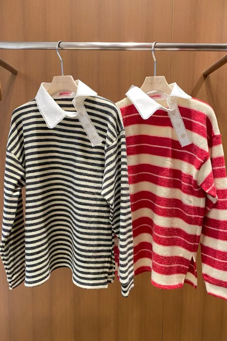 橫條紋設計翻領上衣