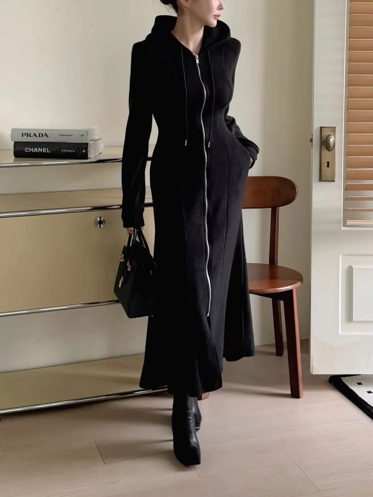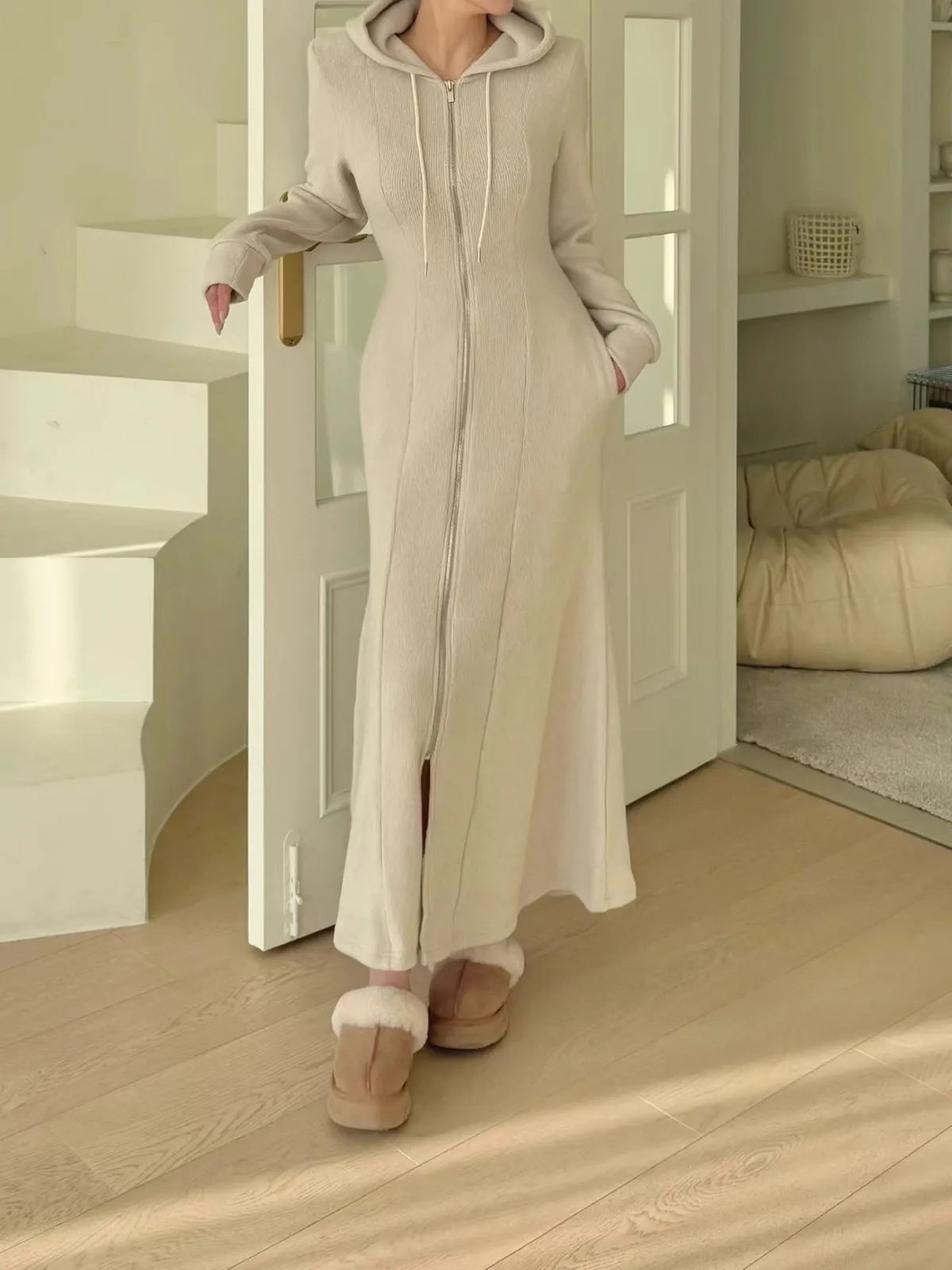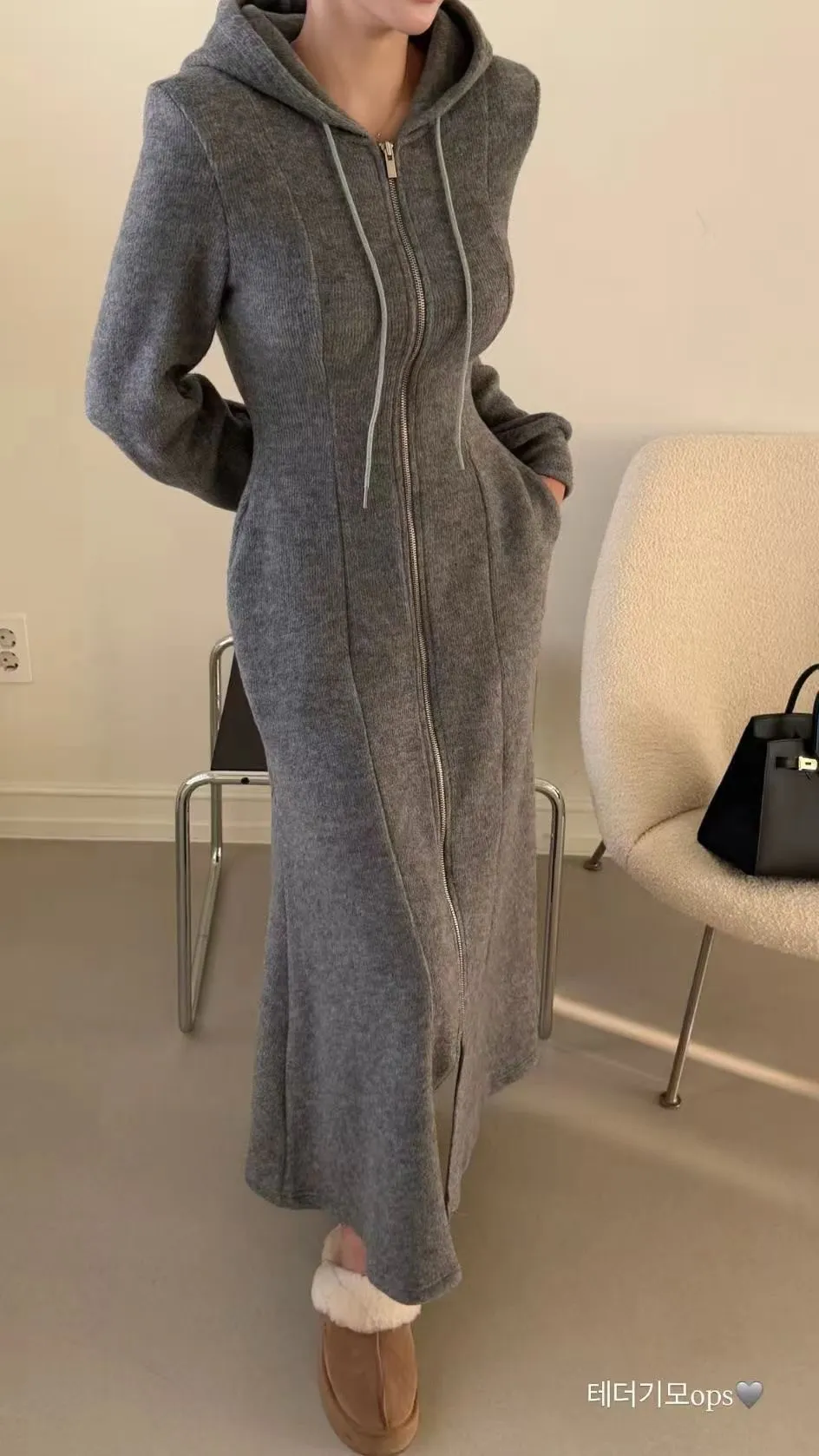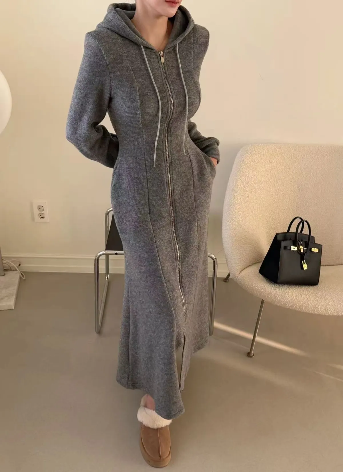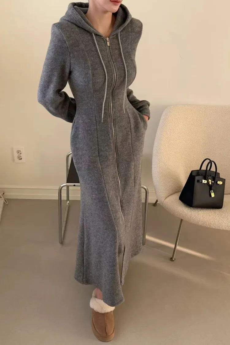 羊毛拉鍊連帽魚尾長洋裝