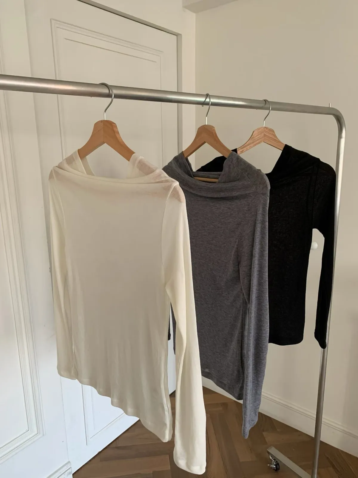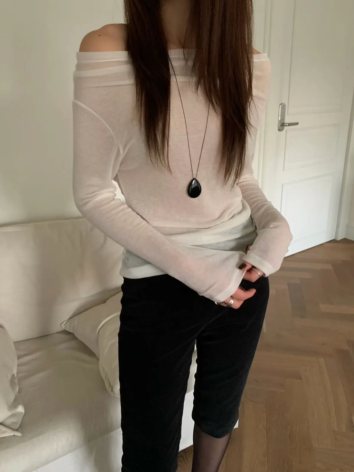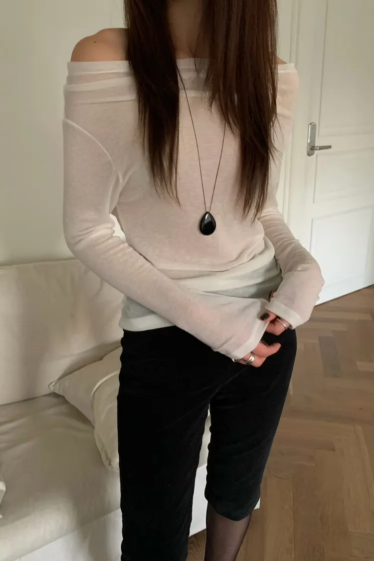 透膚羊毛一字領上衣